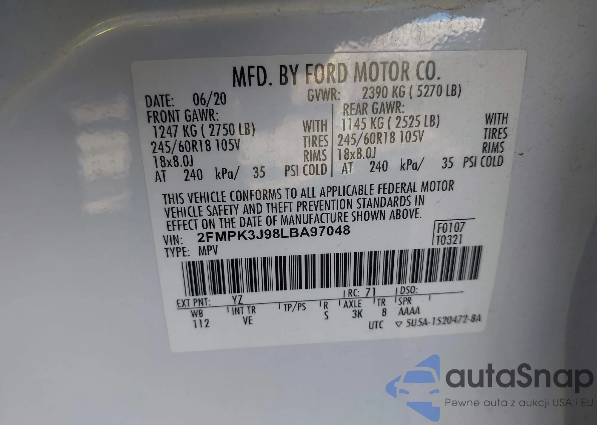 LOT: 43908221 VIN: 2FMPK3J98LBA97048