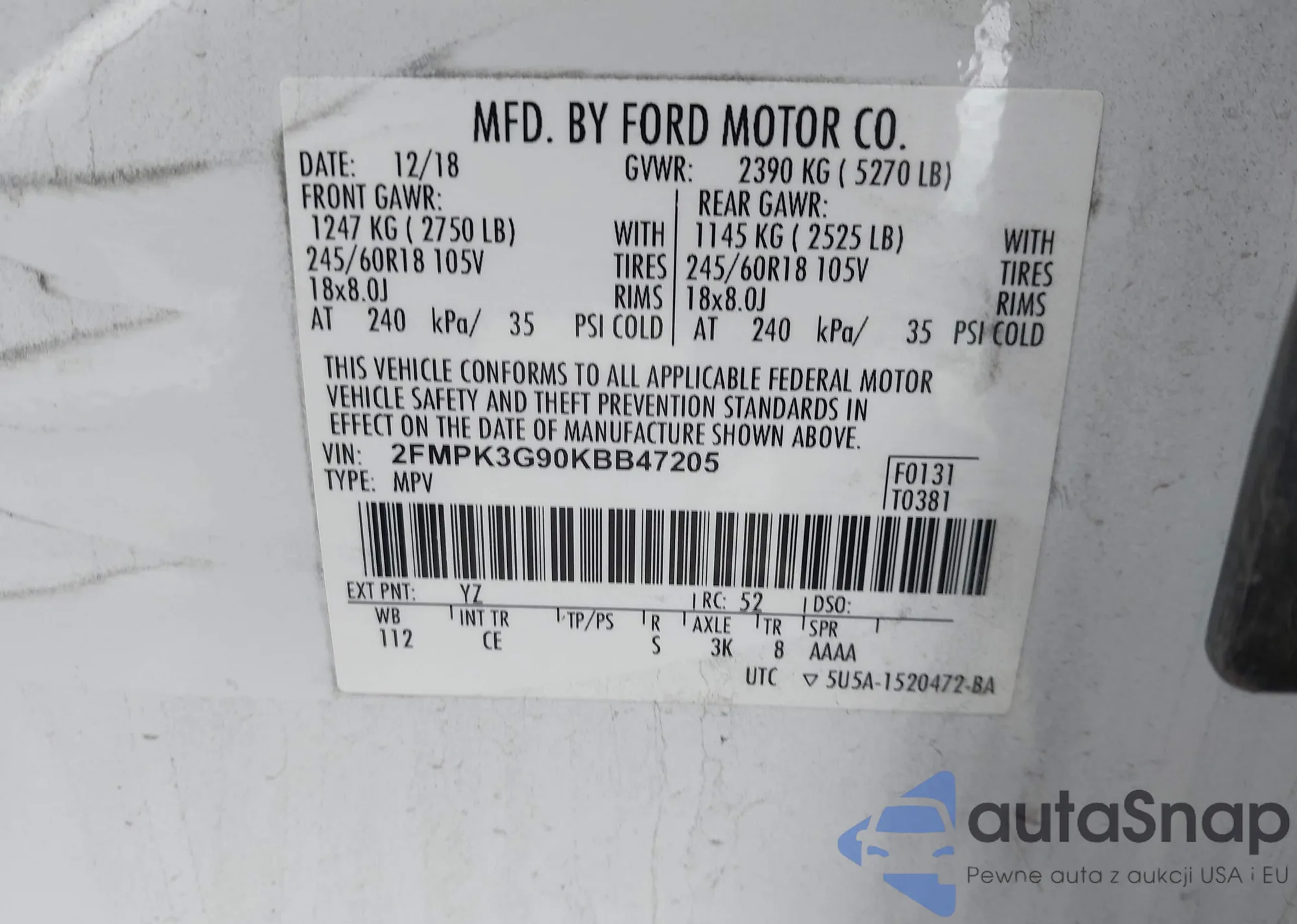 LOT: 43897084 VIN: 2FMPK3G90KBB47205