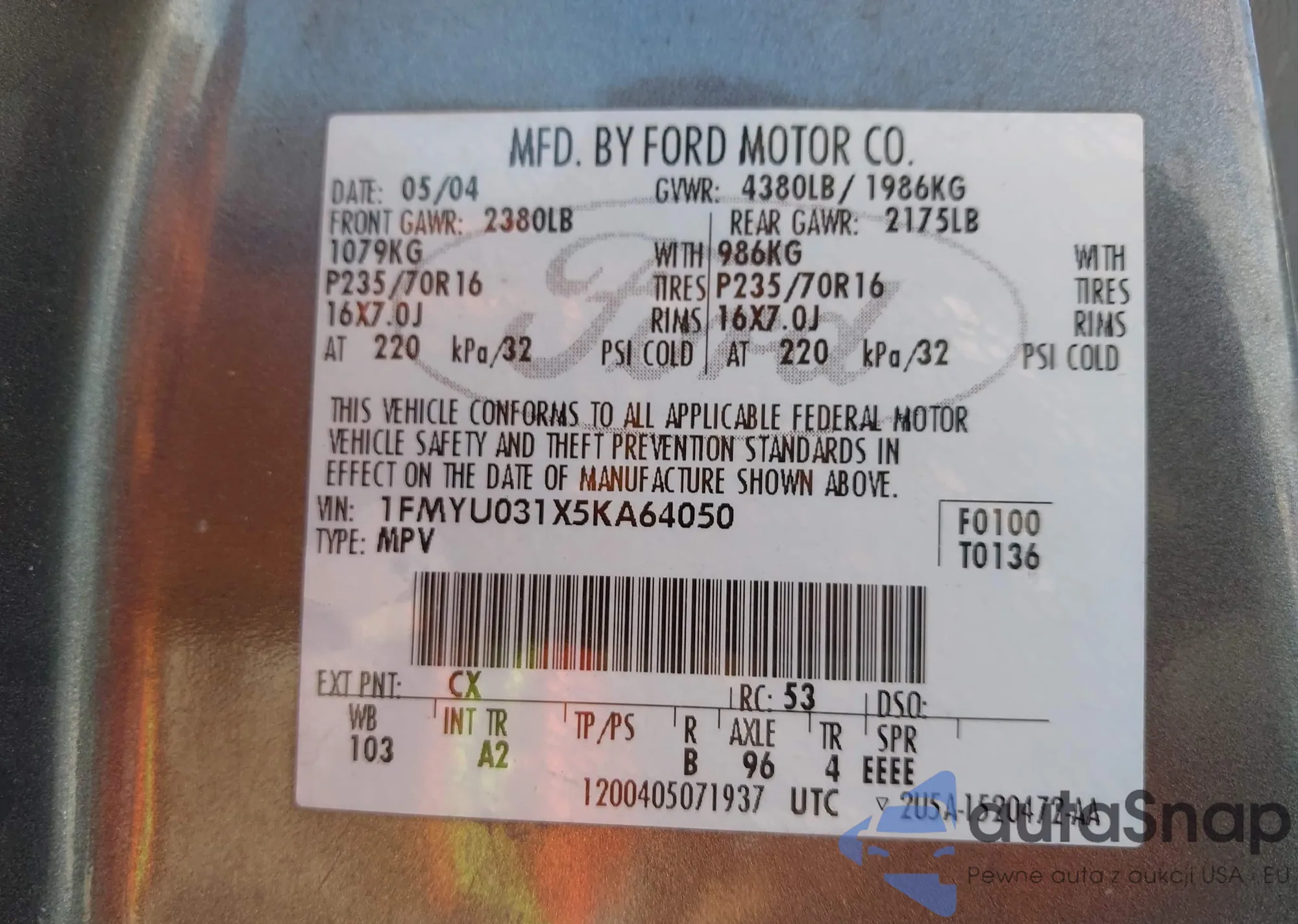• VIN 1FMYU031X5KA64050