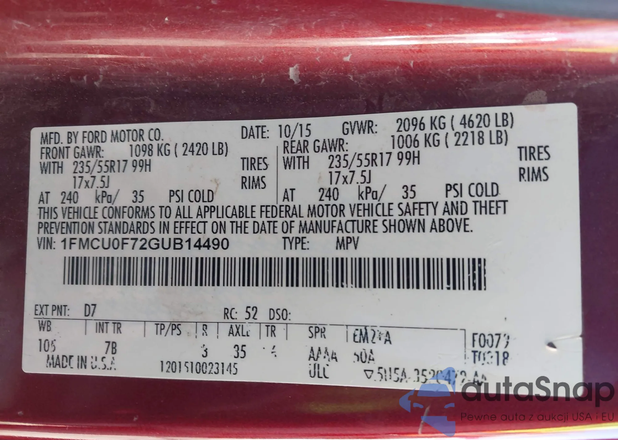 • VIN 1FMCU0F72GUB14490