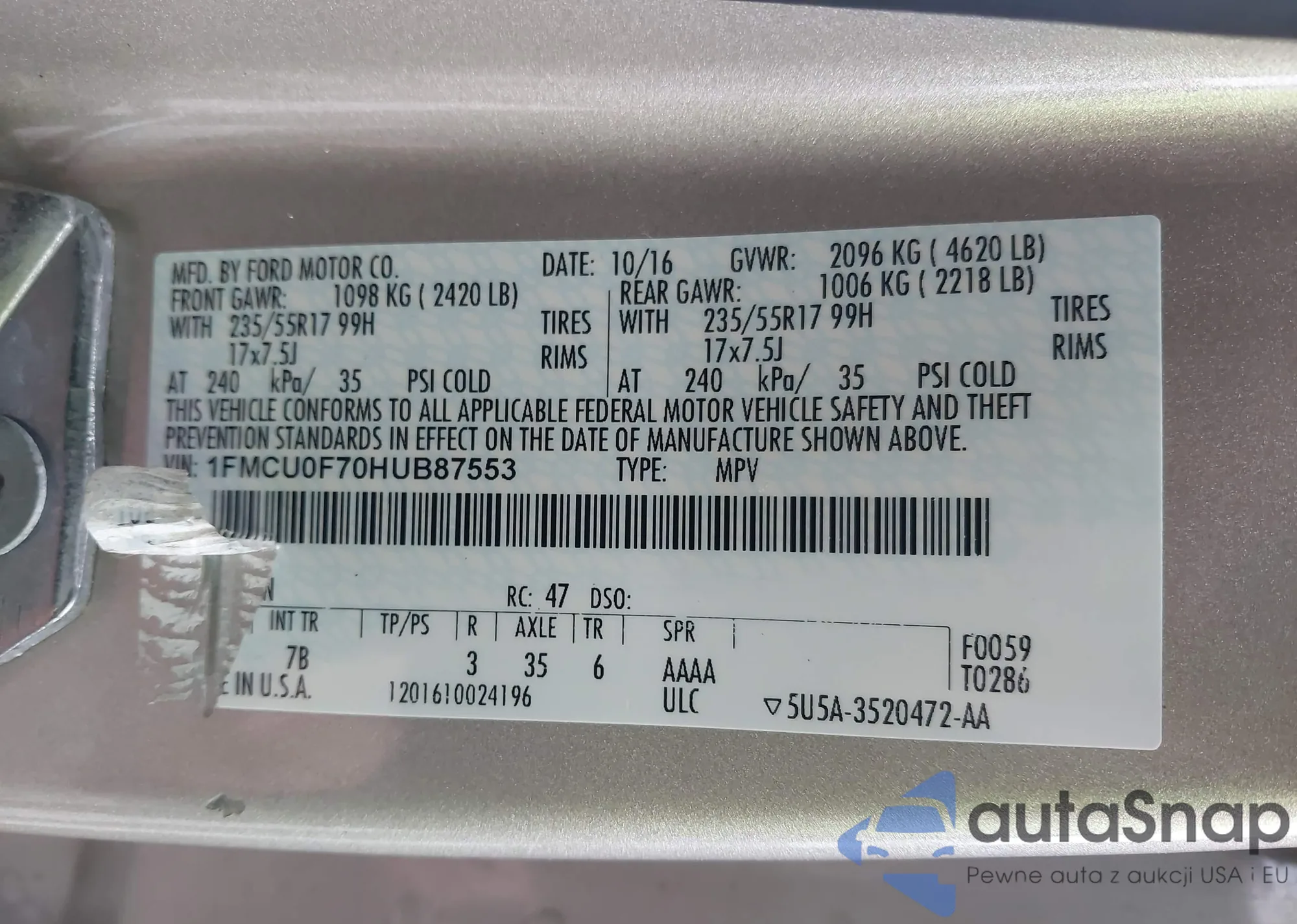 LOT: 44178209 VIN: 1FMCU0F70HUB87553