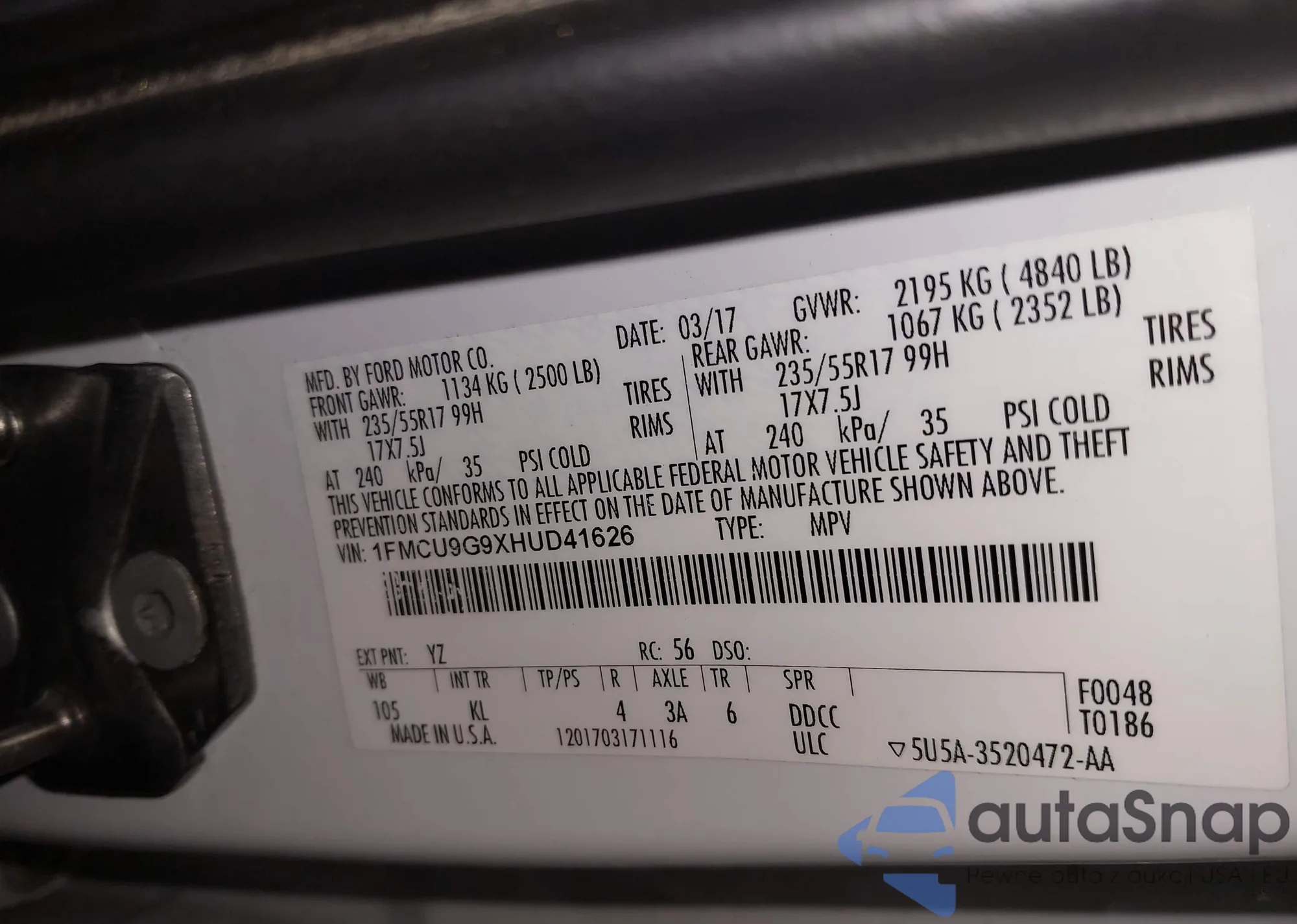 • VIN 1FMCU9G9XHUD41626