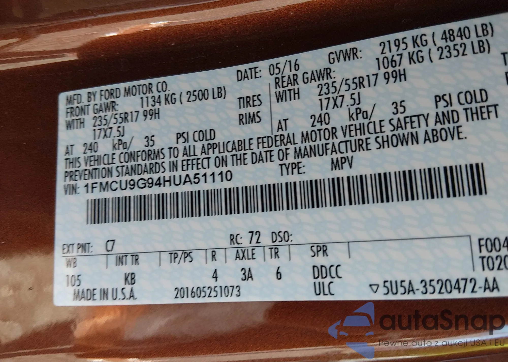 LOT: 44380150 VIN: 1FMCU9G94HUA51110