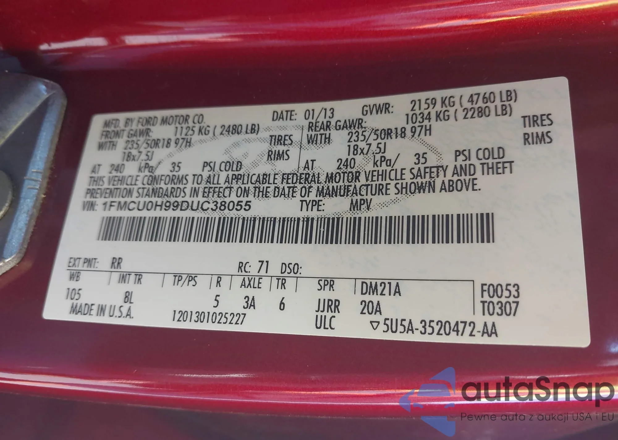 • VIN 1FMCU9GX8DUA60871