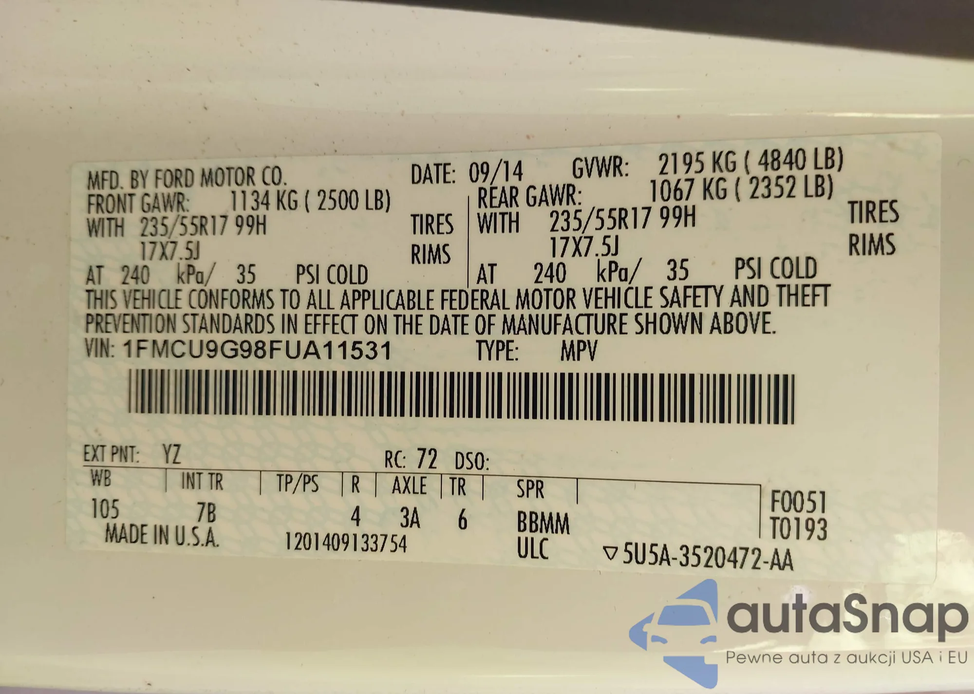 LOT: 44142669 VIN: 1FMCU9G98FUA11531