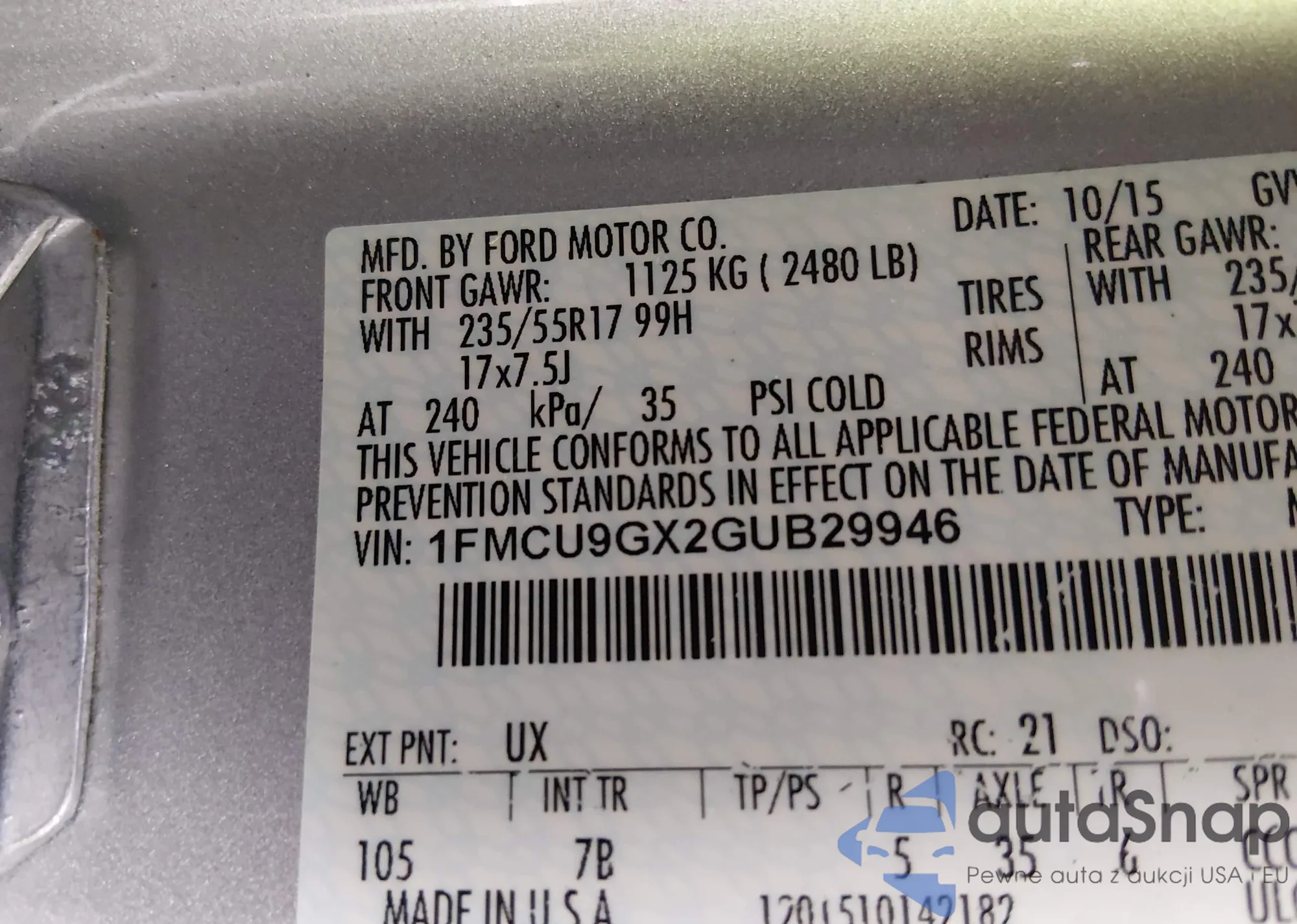 LOT: 92608435 VIN: 1FMCU0GX5GUB52276