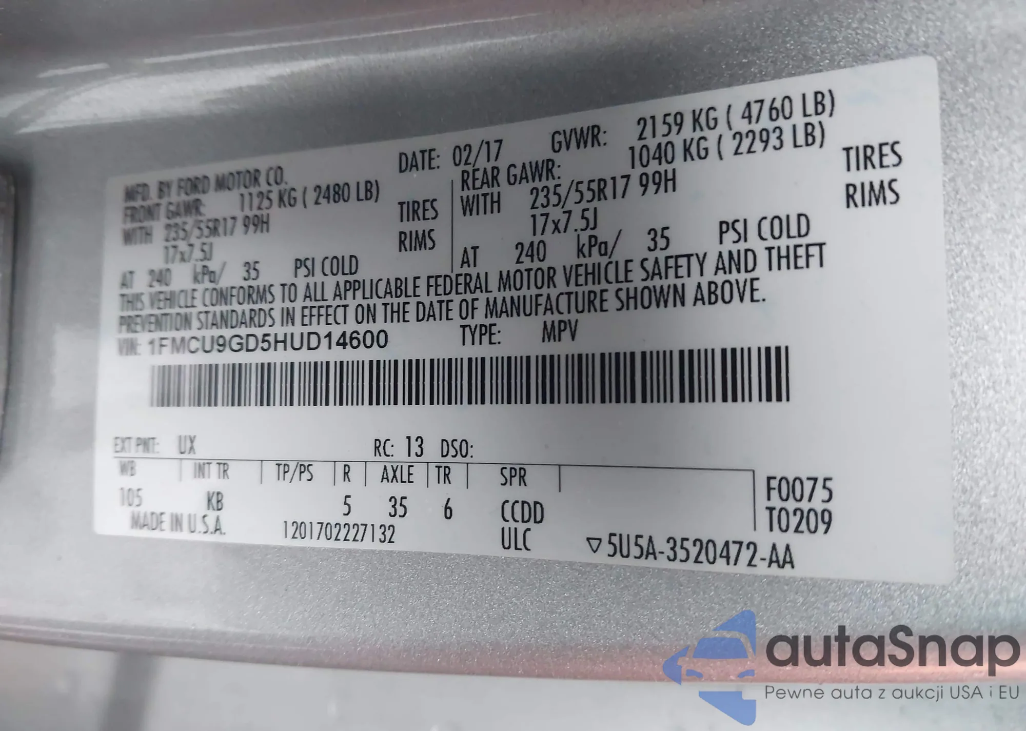 • VIN 1FMCU9GX3DUC82475