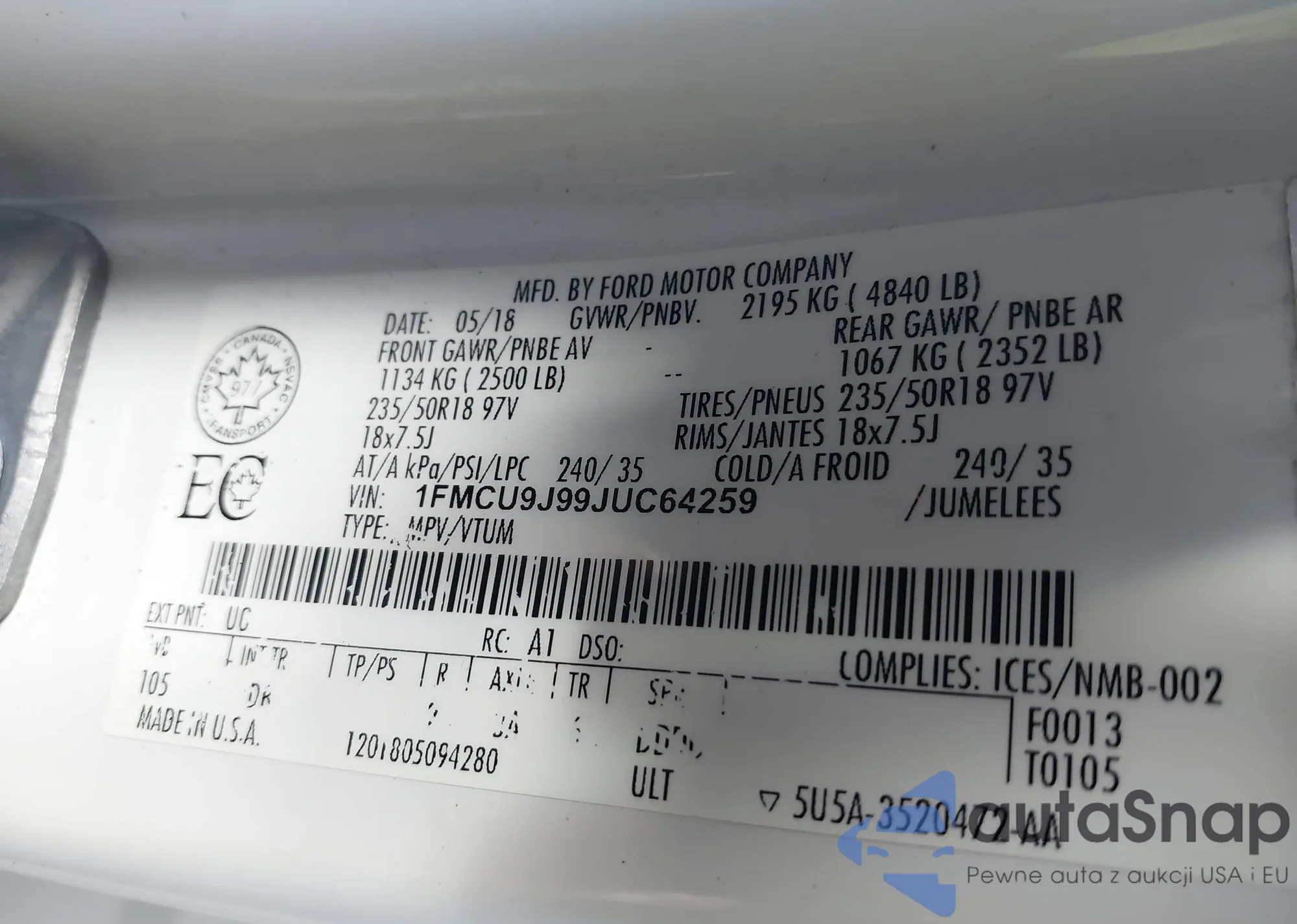 LOT: 44136597 VIN: 1FMCU9J99JUC64259