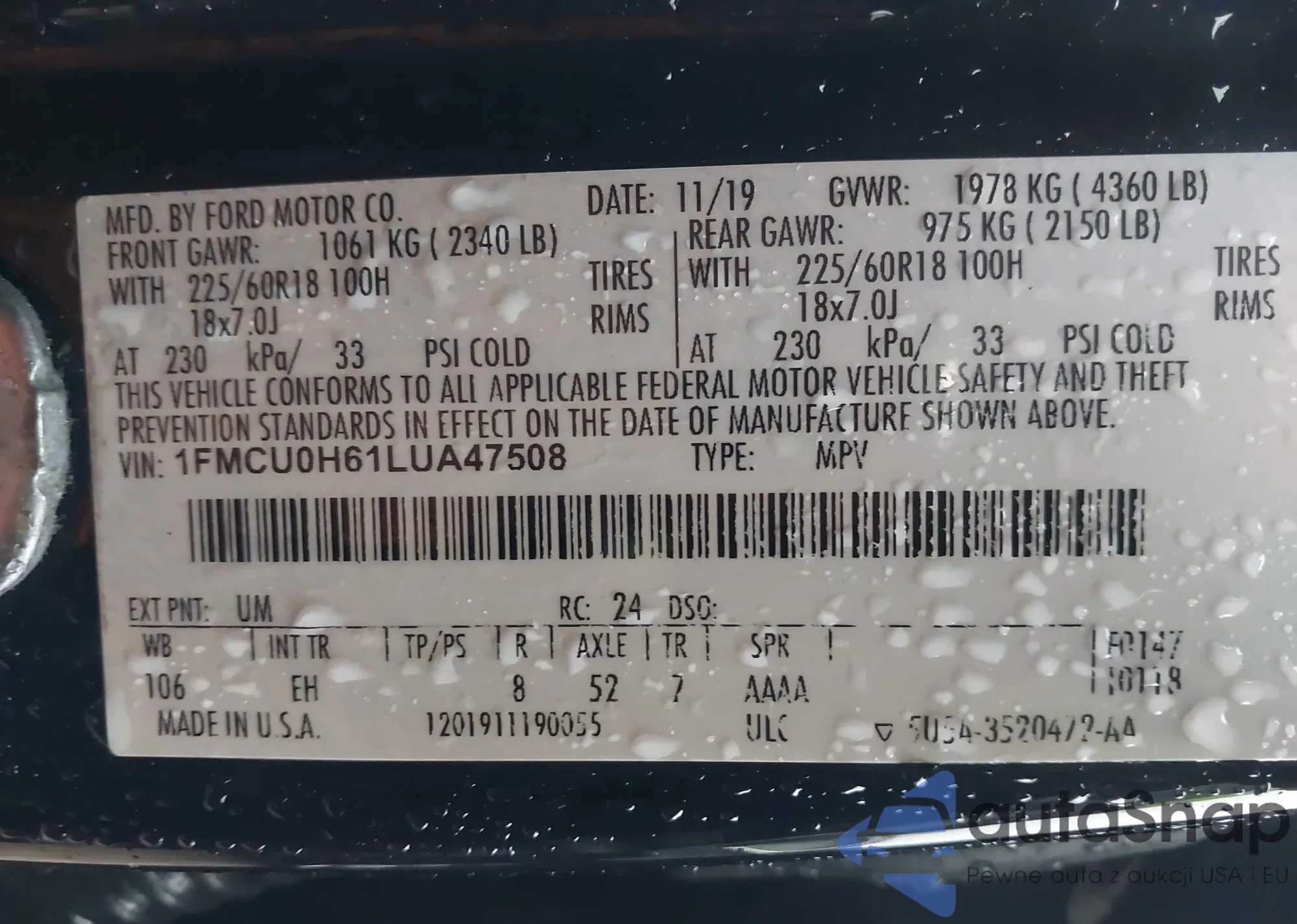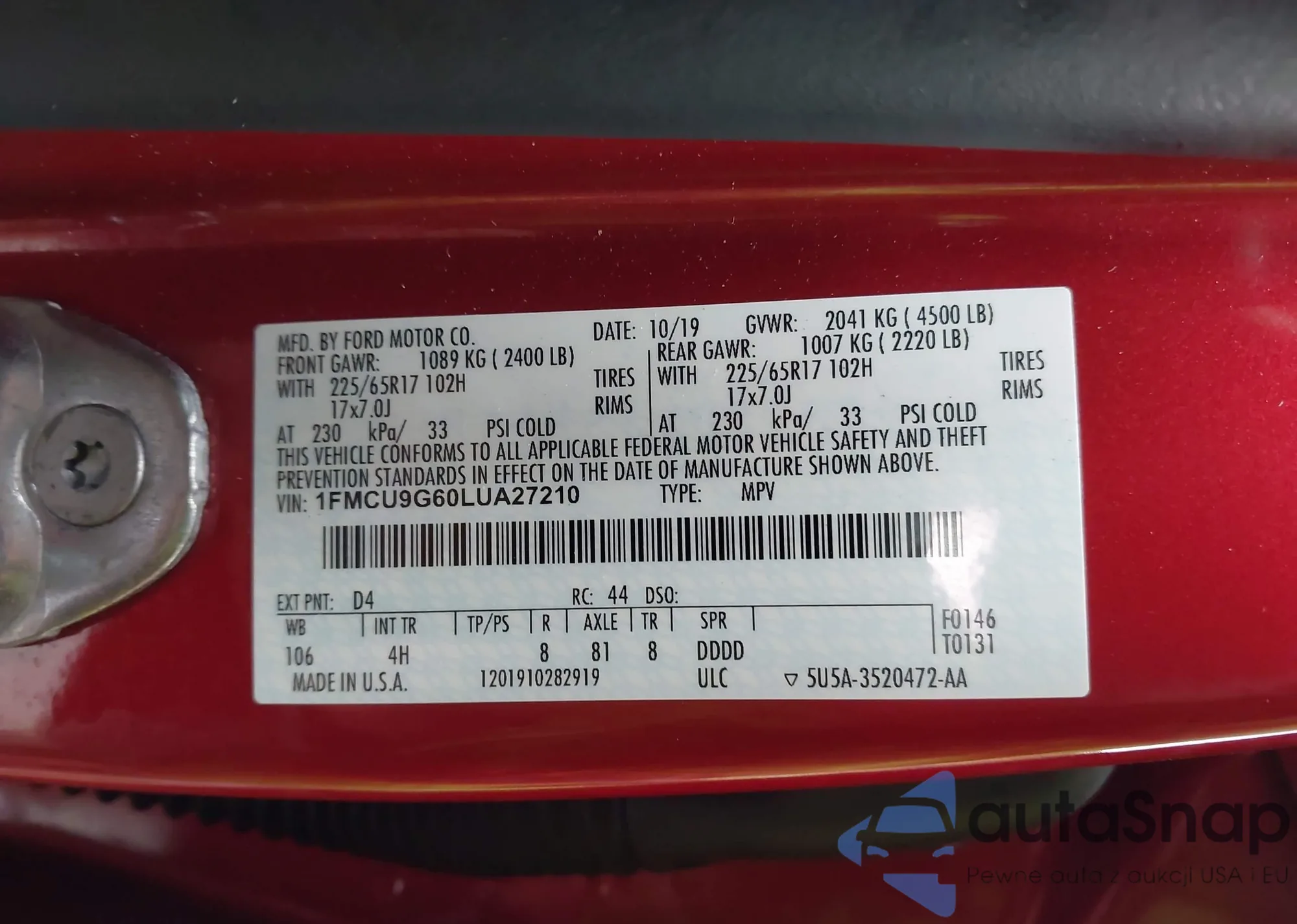 LOT: 44409380 VIN: 1FMCU9G60LUA27210