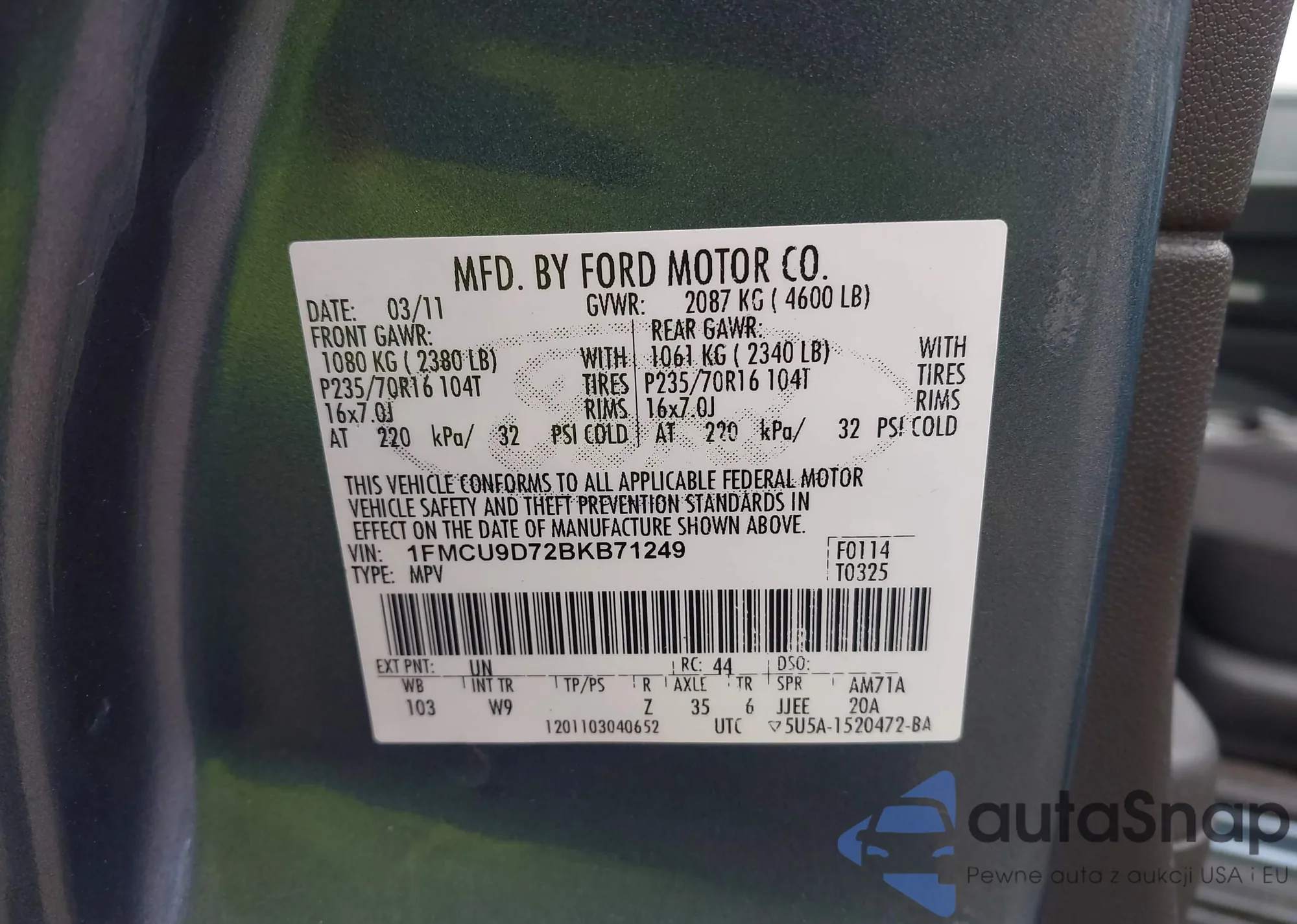 • VIN 1FMCU9D72BKB71249
