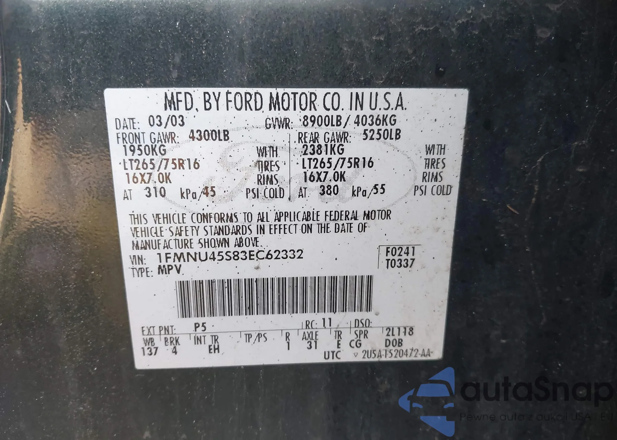 LOT: 44355064 VIN: 1FMNU45S83EC62332