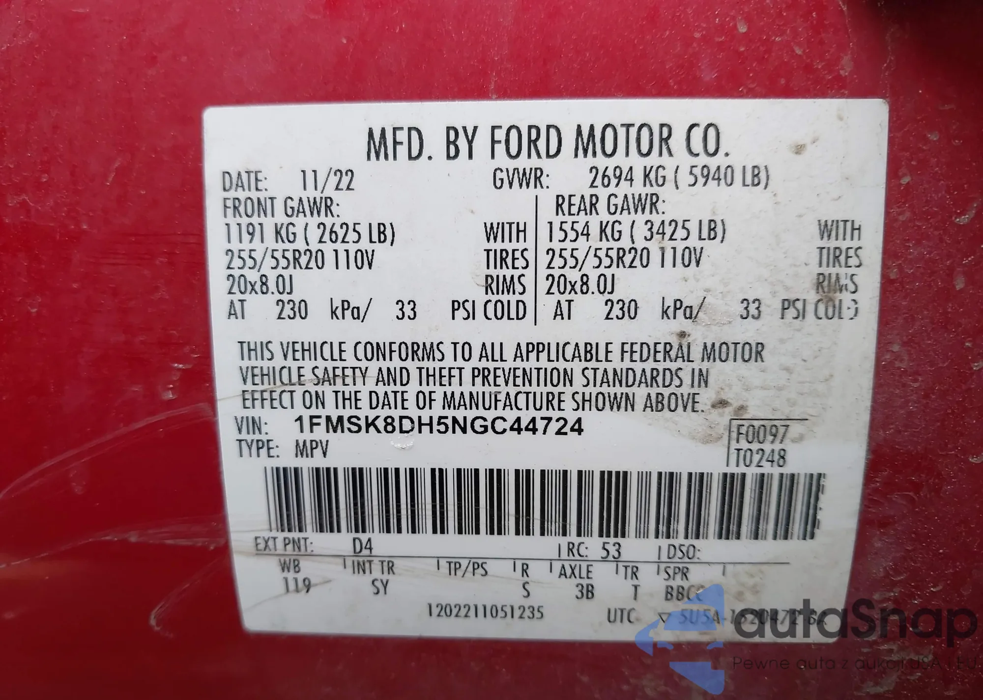 • VIN 1FMSK8DH5NGC44724