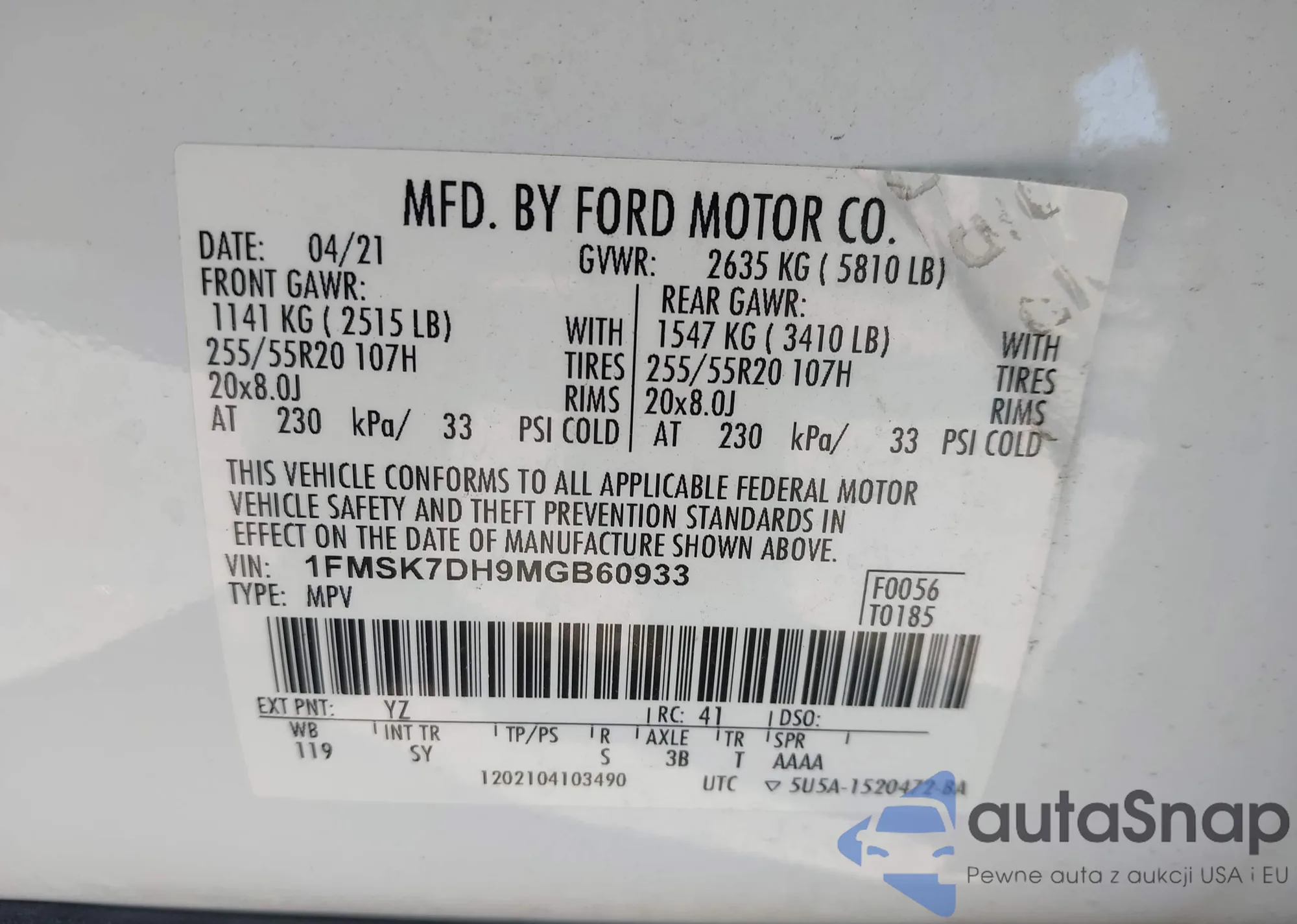 • VIN 1FMSK7DH9MGB60933