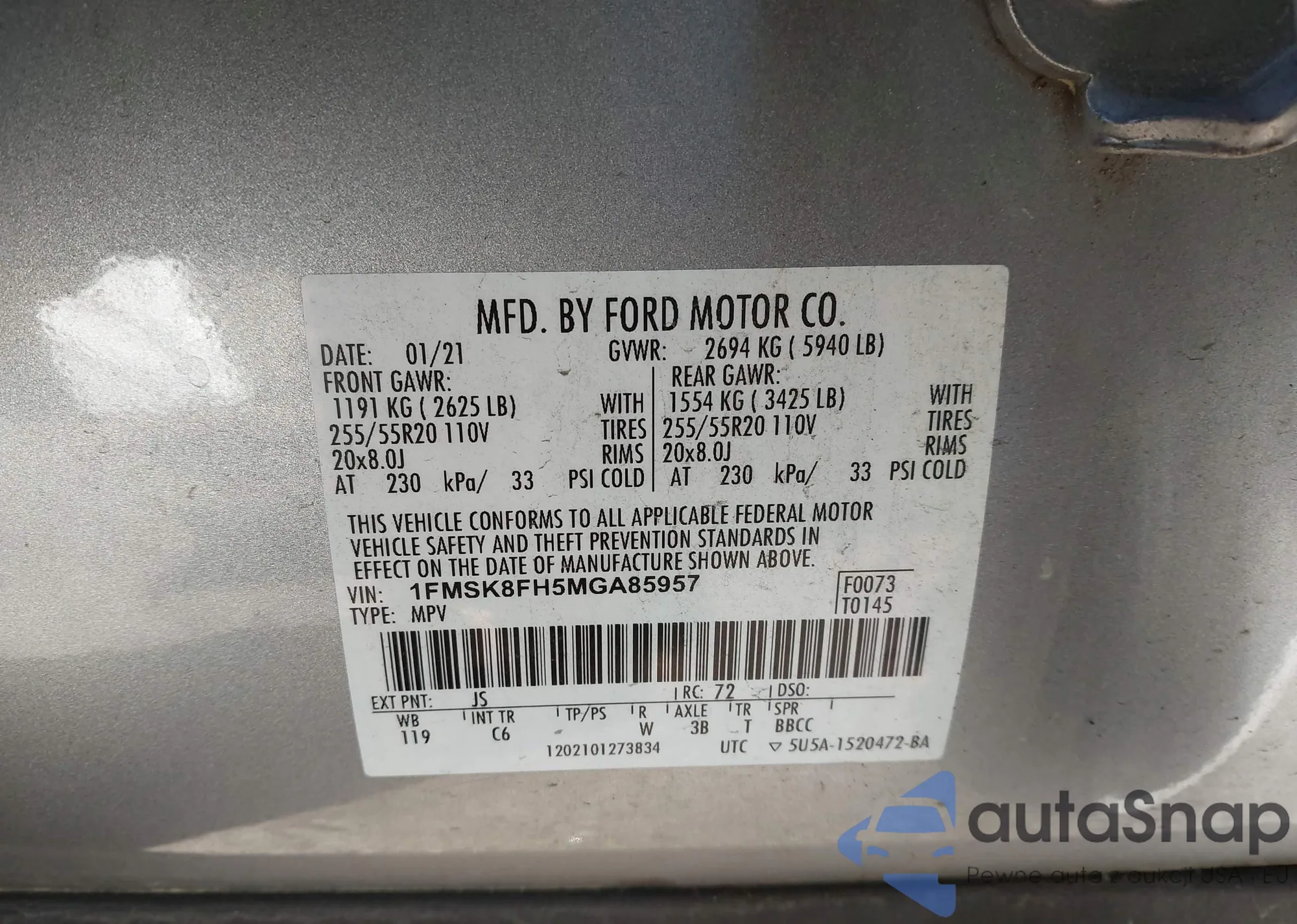 • VIN 1FMSK8FH5MGA85957