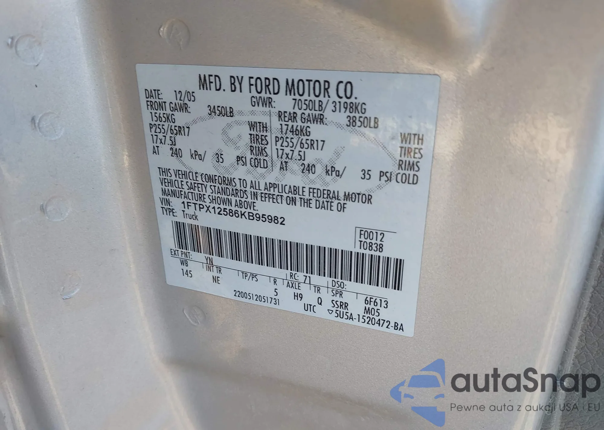 LOT: 44269815 VIN: 1FTPW14545KC82986