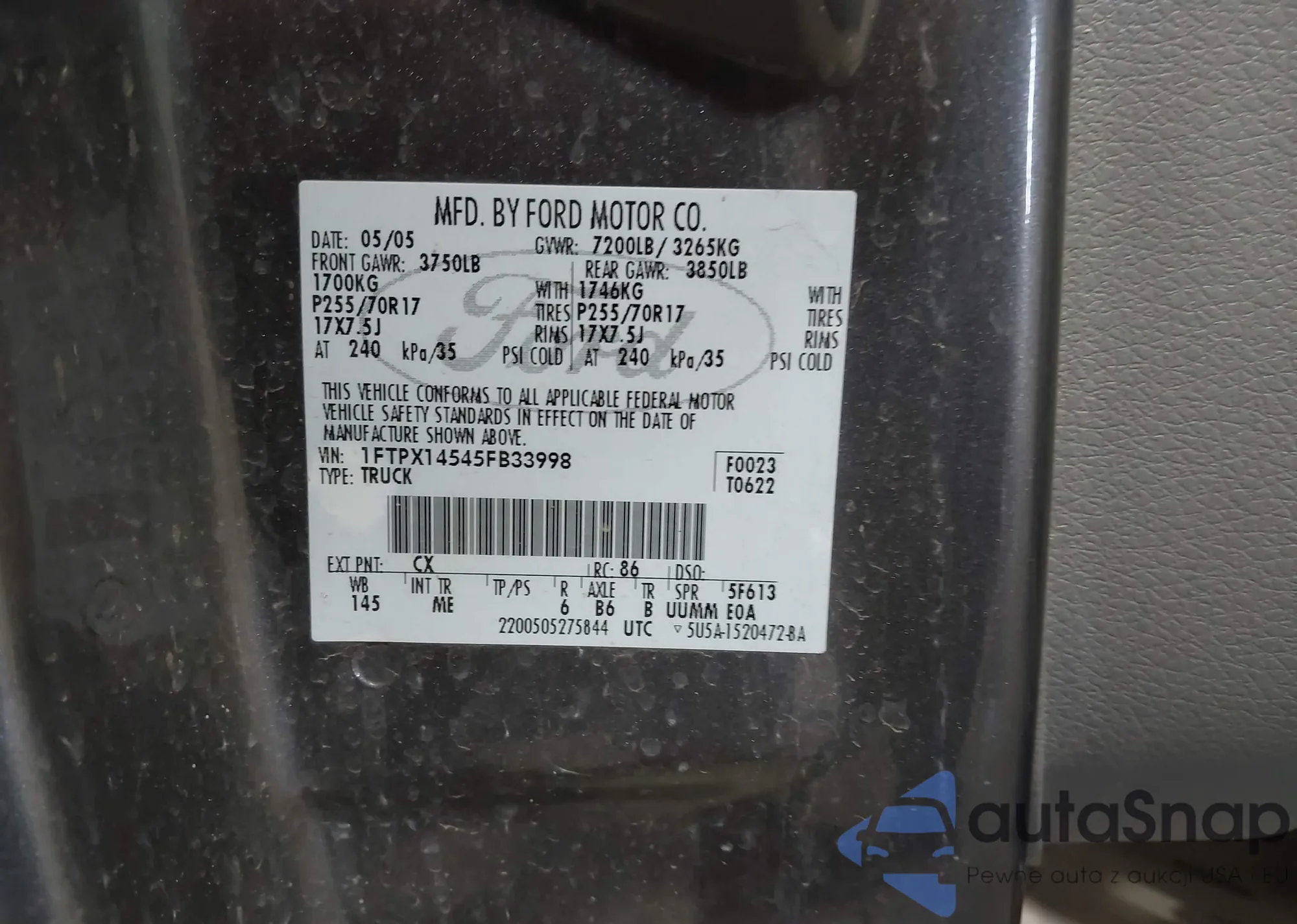 LOT: 44072054 VIN: 1FTPW14585FB03759