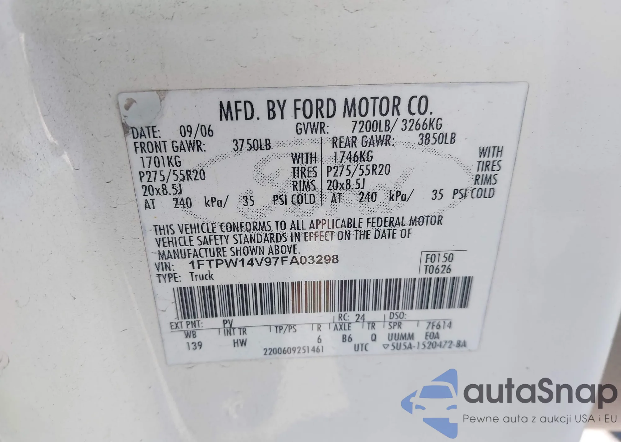 LOT: 44303500 VIN: 1FTPW14V97FA03298