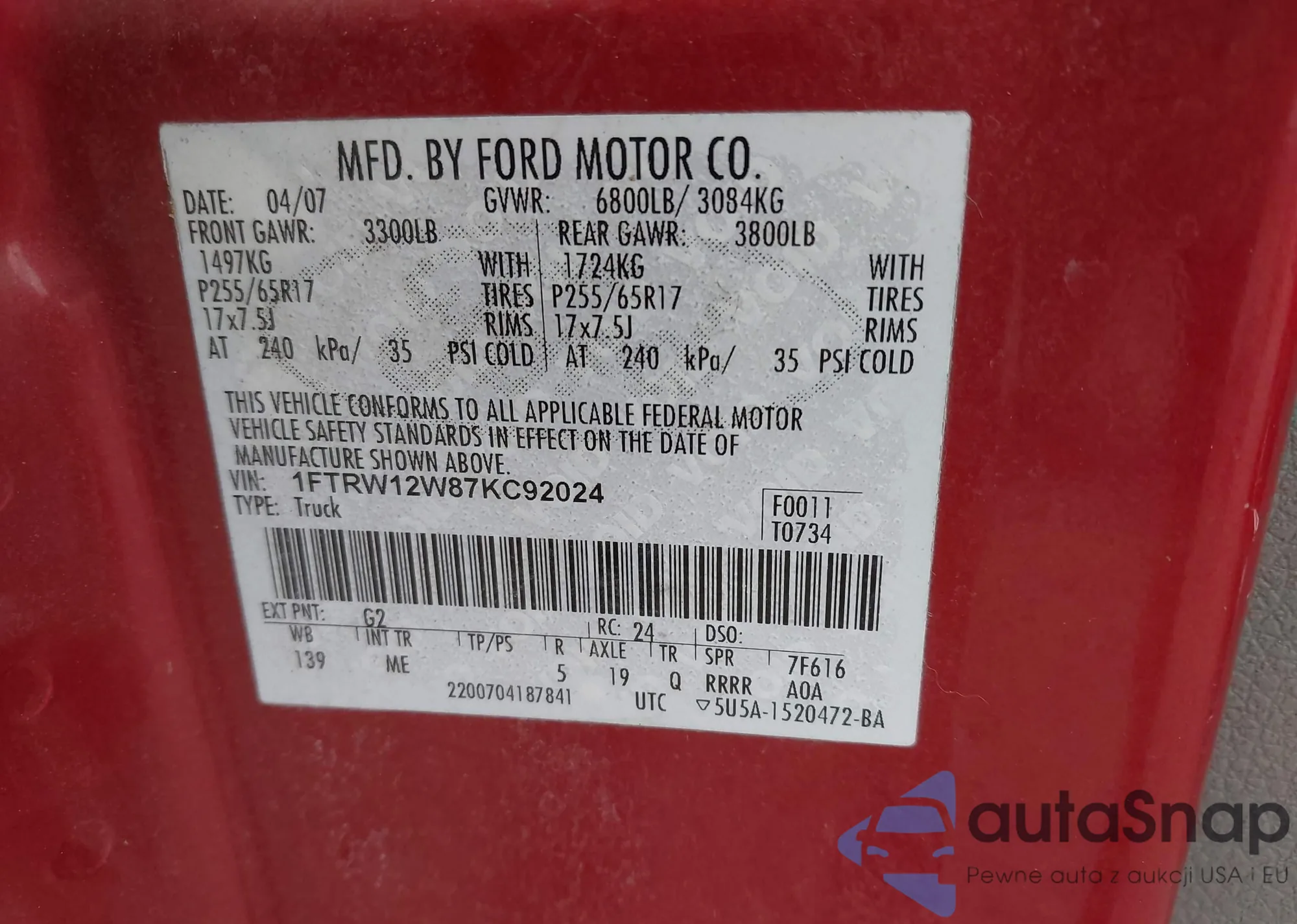 • VIN 1FTRW12W87KC92024