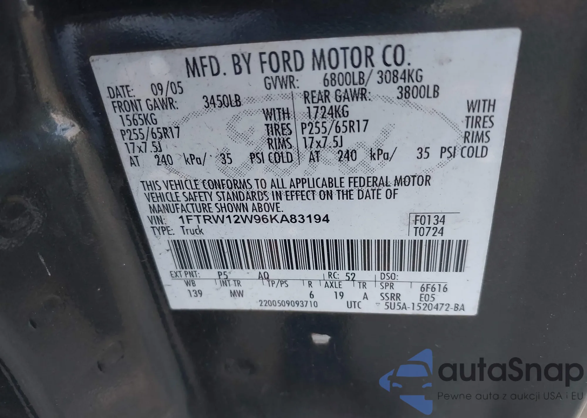 LOT: 44364199 VIN: 1FTRW12W25KE93561