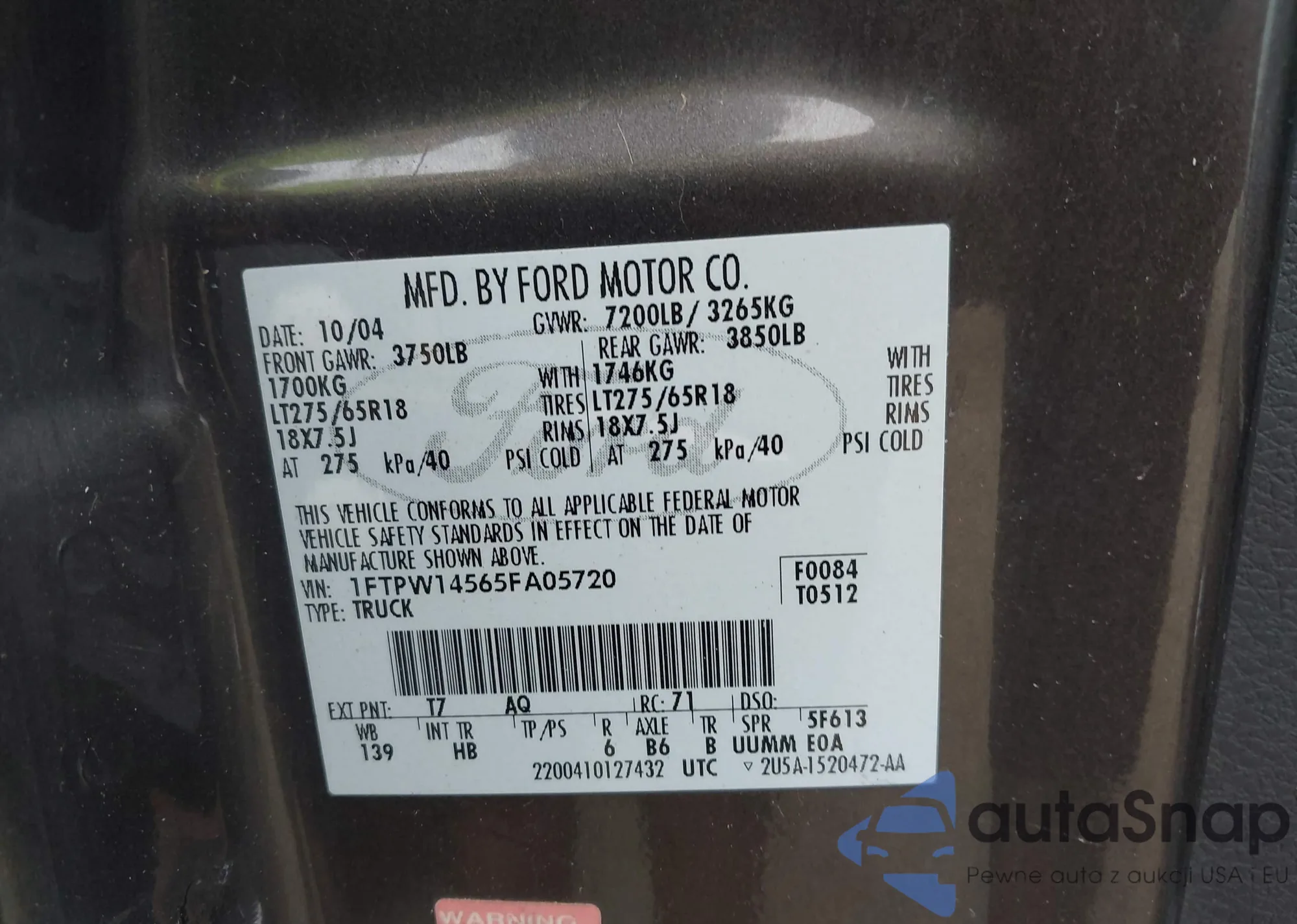 • VIN 1FTPW14565FA05720