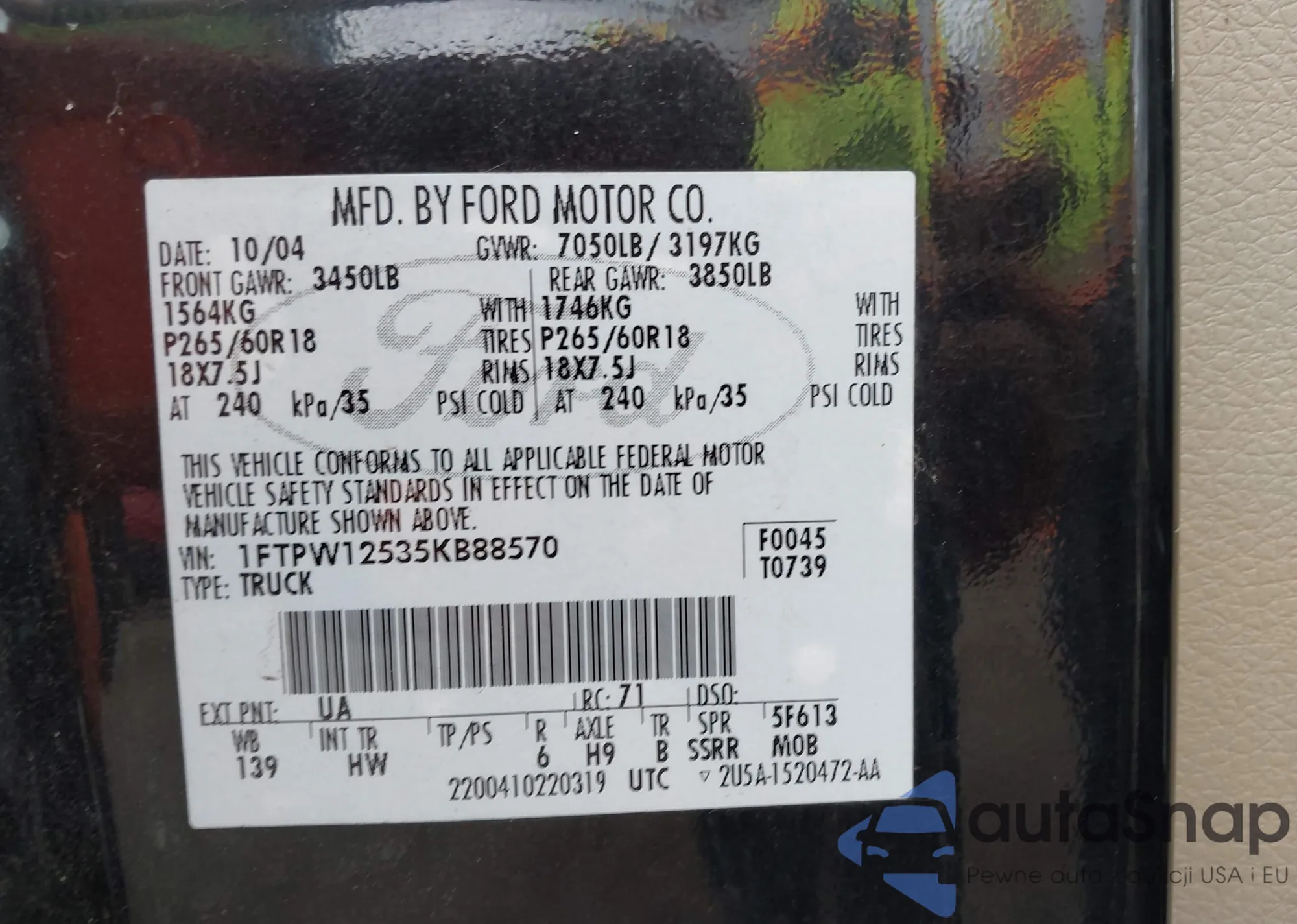 • VIN 1FTPW12535KB88570