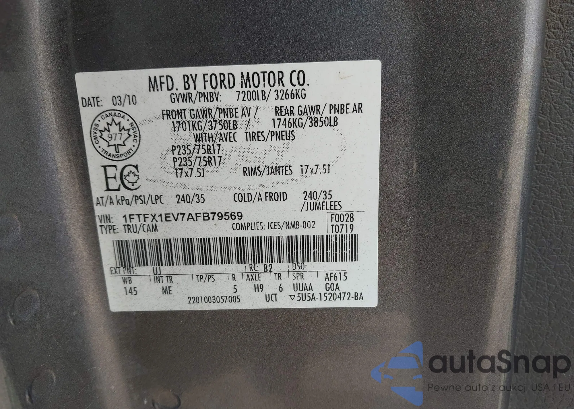 2010 Ford F-150 Fx4/Lariat/Xl/Xlt z USA, uszkodzony, nr VIN 1FTFX1EV7AFB79569