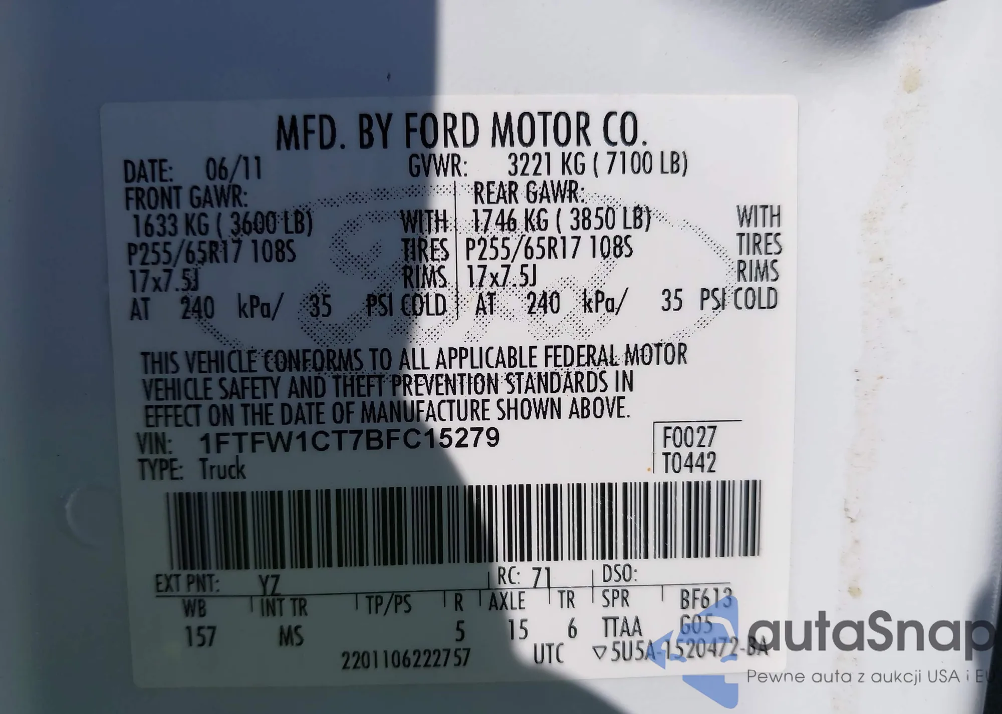 LOT: 43592262 VIN: 1FTFW1CT7BFC15279