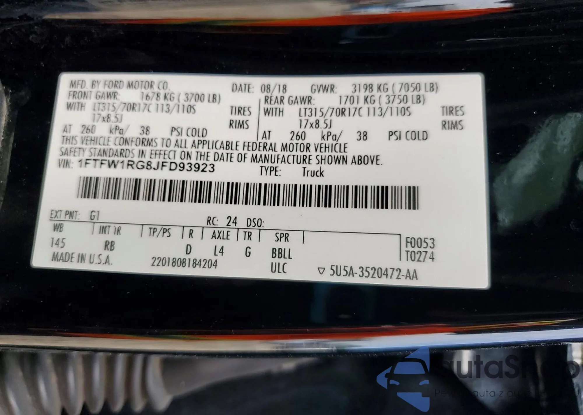 • VIN 1FTFW1RG8JFD93923