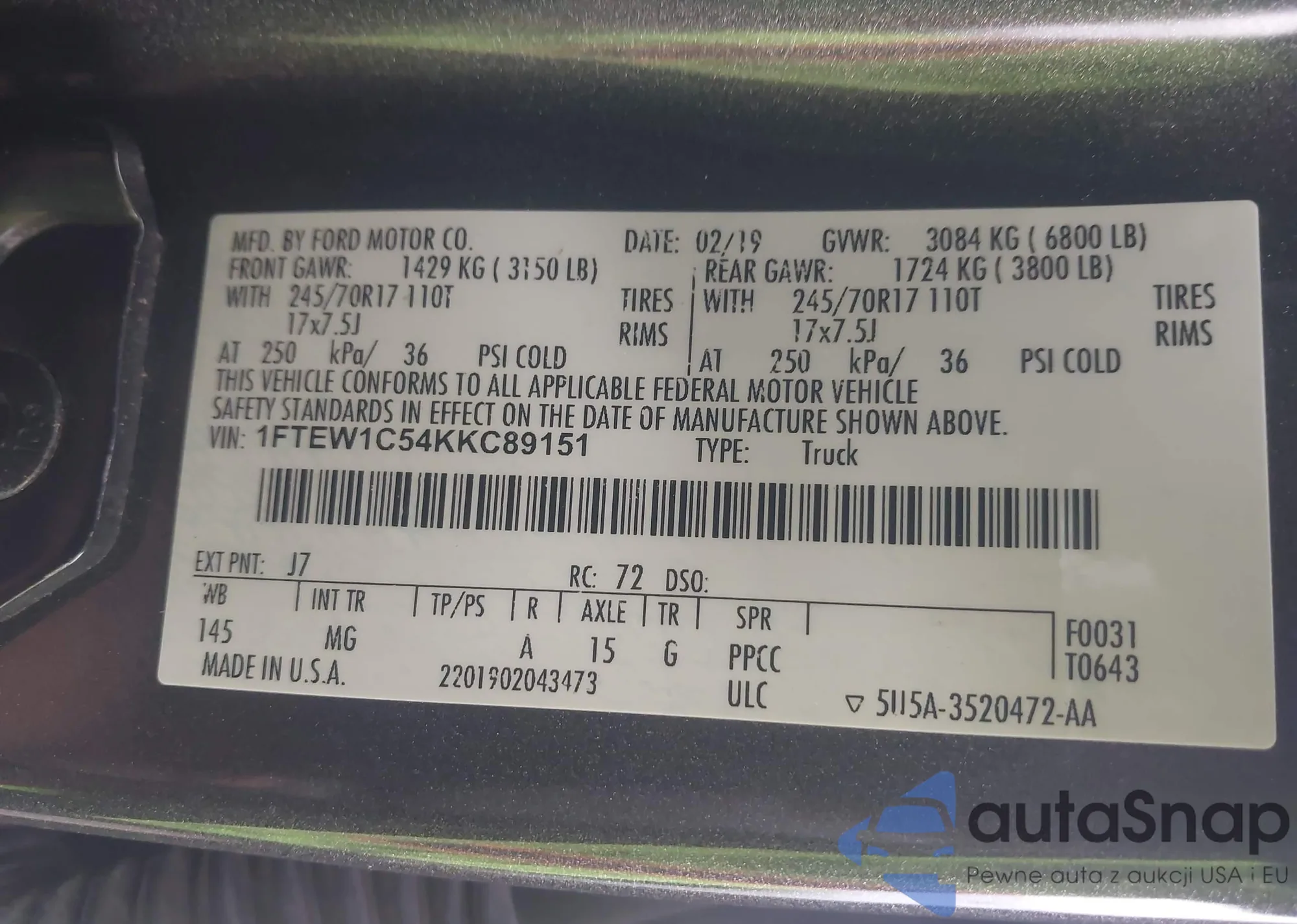 LOT: 43977039 VIN: 1FTEW1C54KKC89151