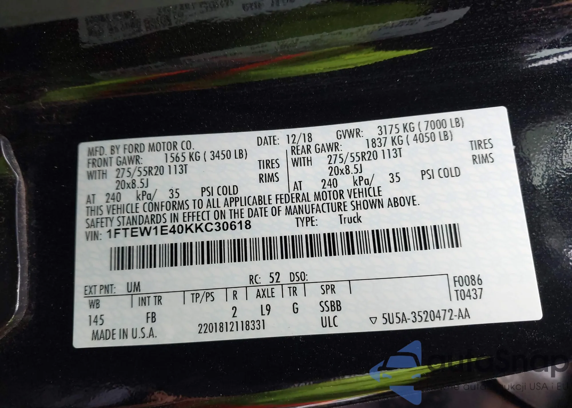• VIN 1FTEW1E40KKC30618