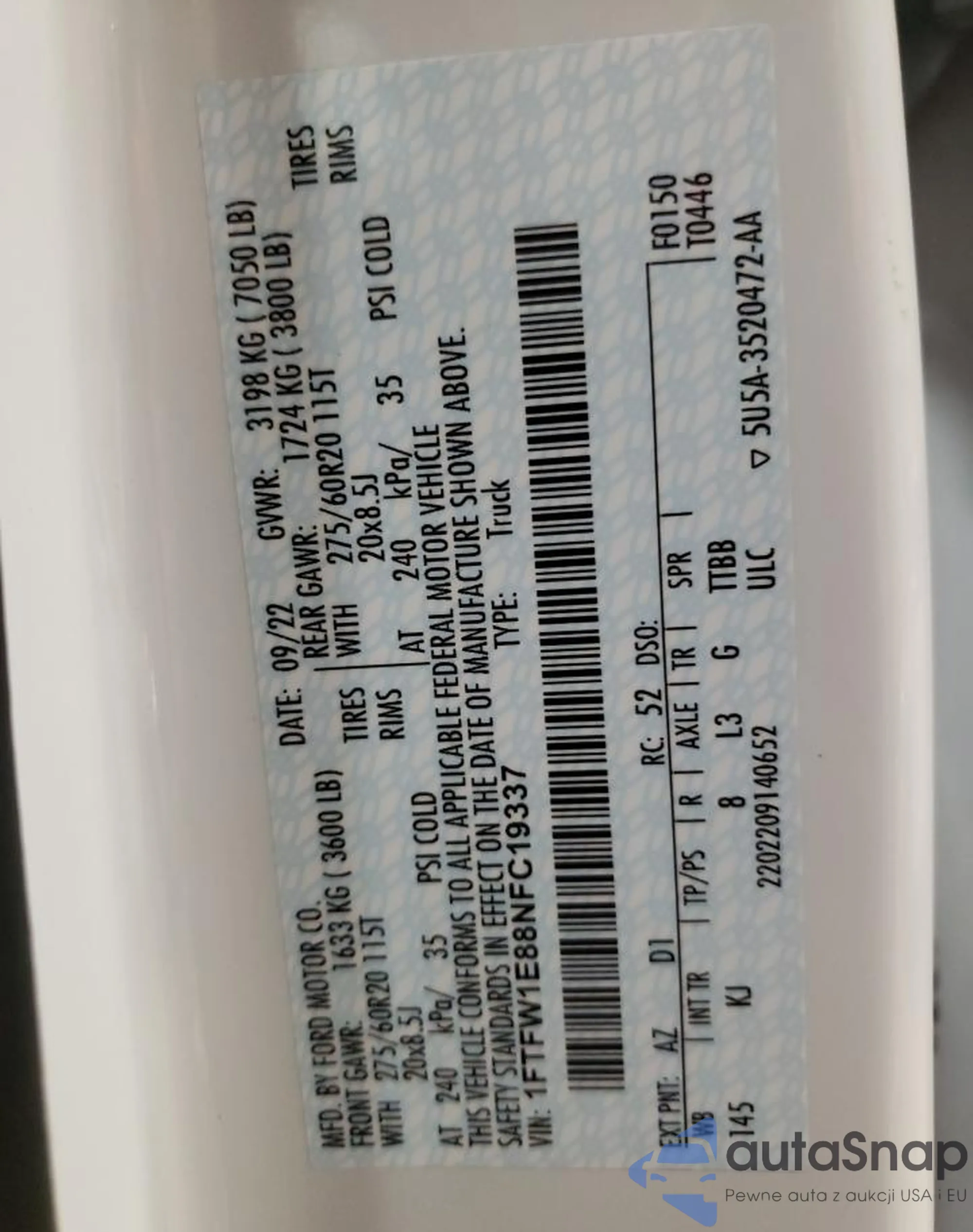 LOT: 78536193 VIN: 1FTFW1E88NFC19337