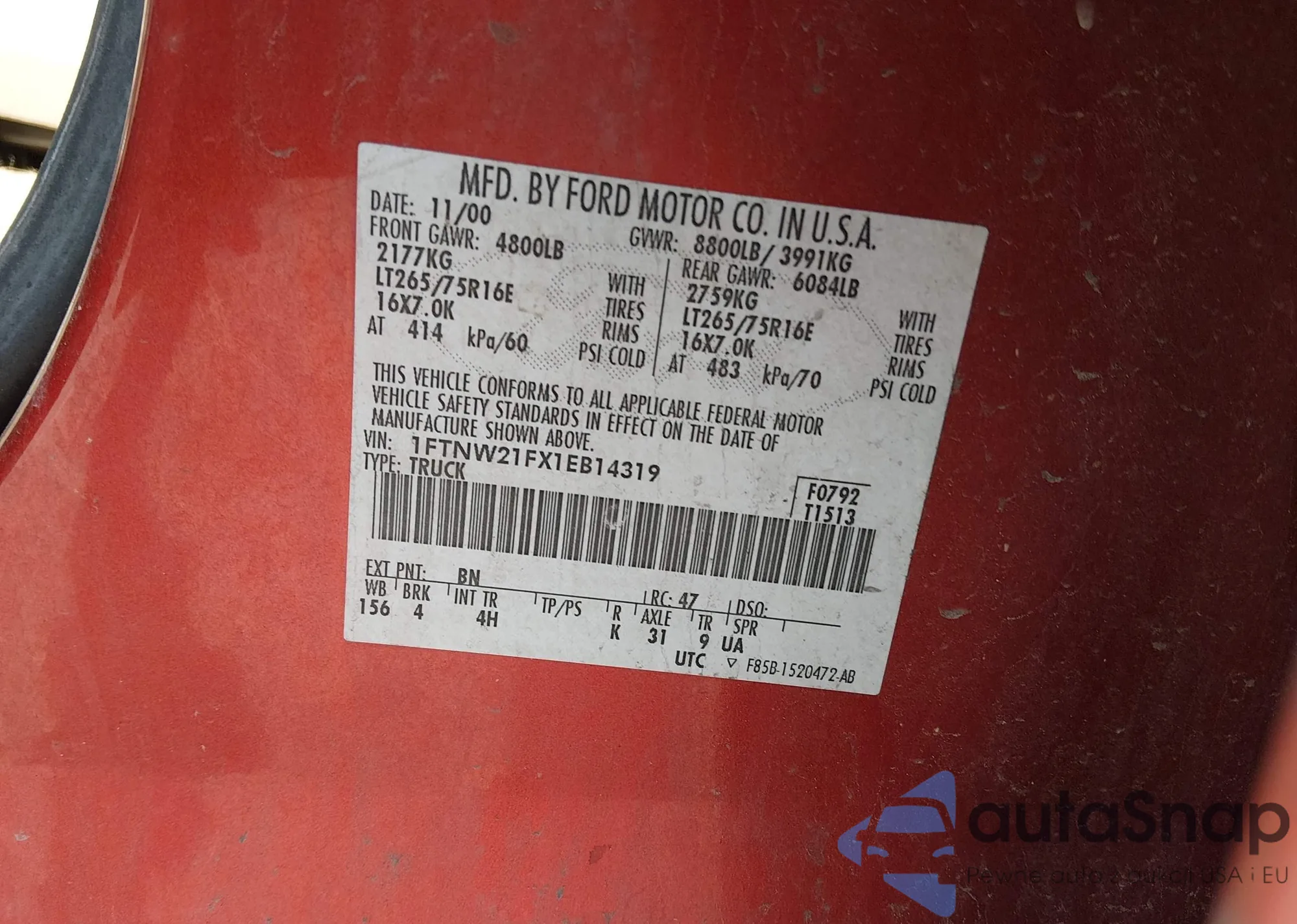 • VIN 1FTNW21FX1EB14319