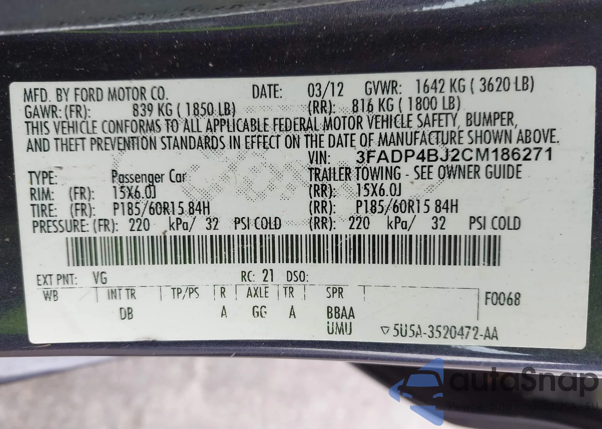 LOT: 44460927 VIN: 3FADP4BJ2CM186271