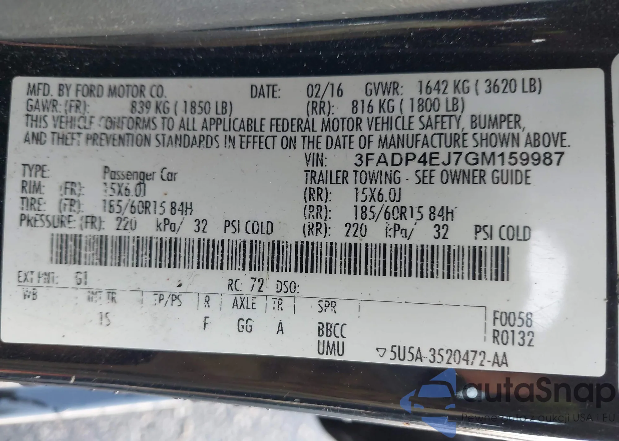 LOT: 44462272 VIN: 3FADP4EJ7GM159987