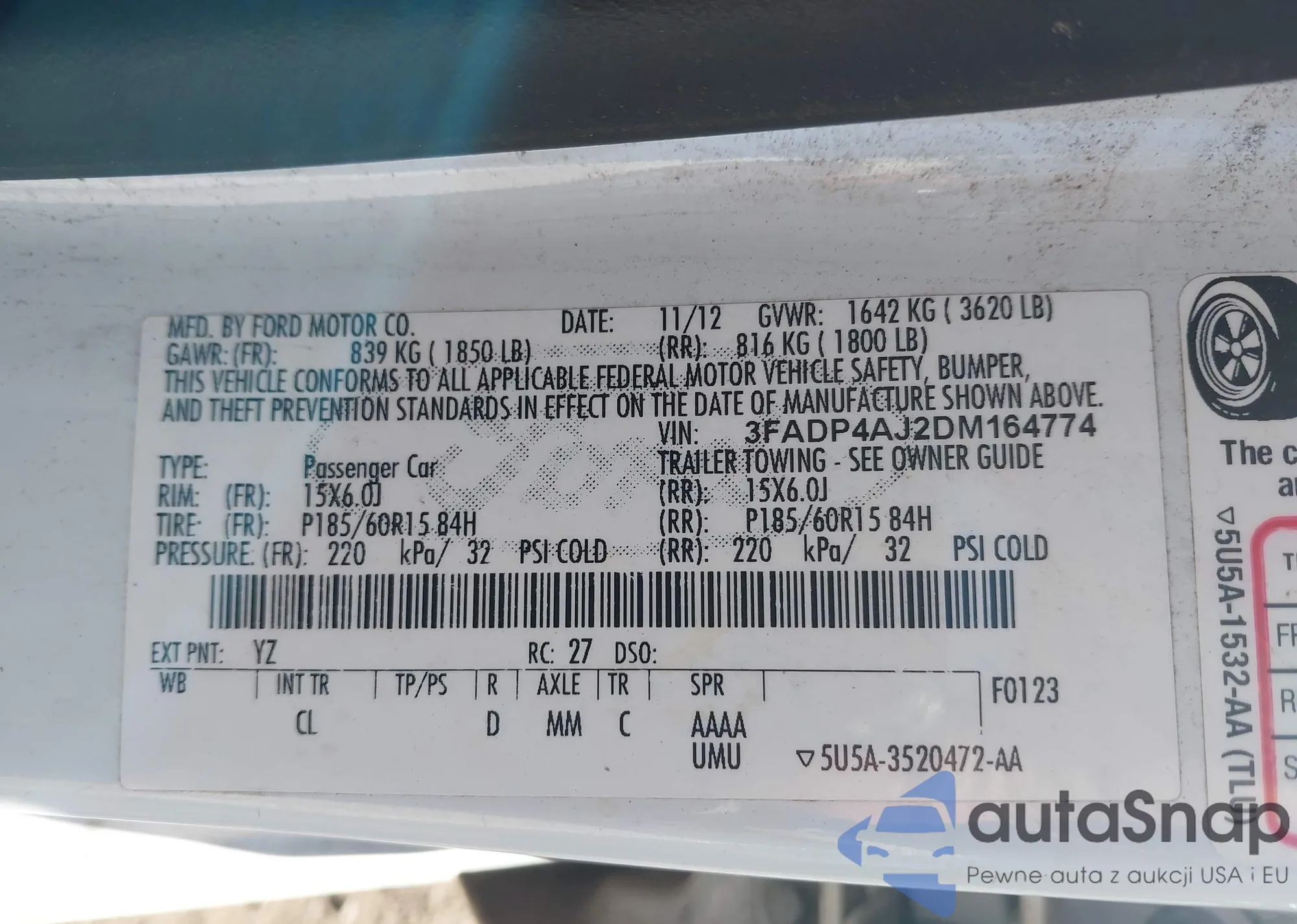 • VIN 3FADP4AJ2DM164774
