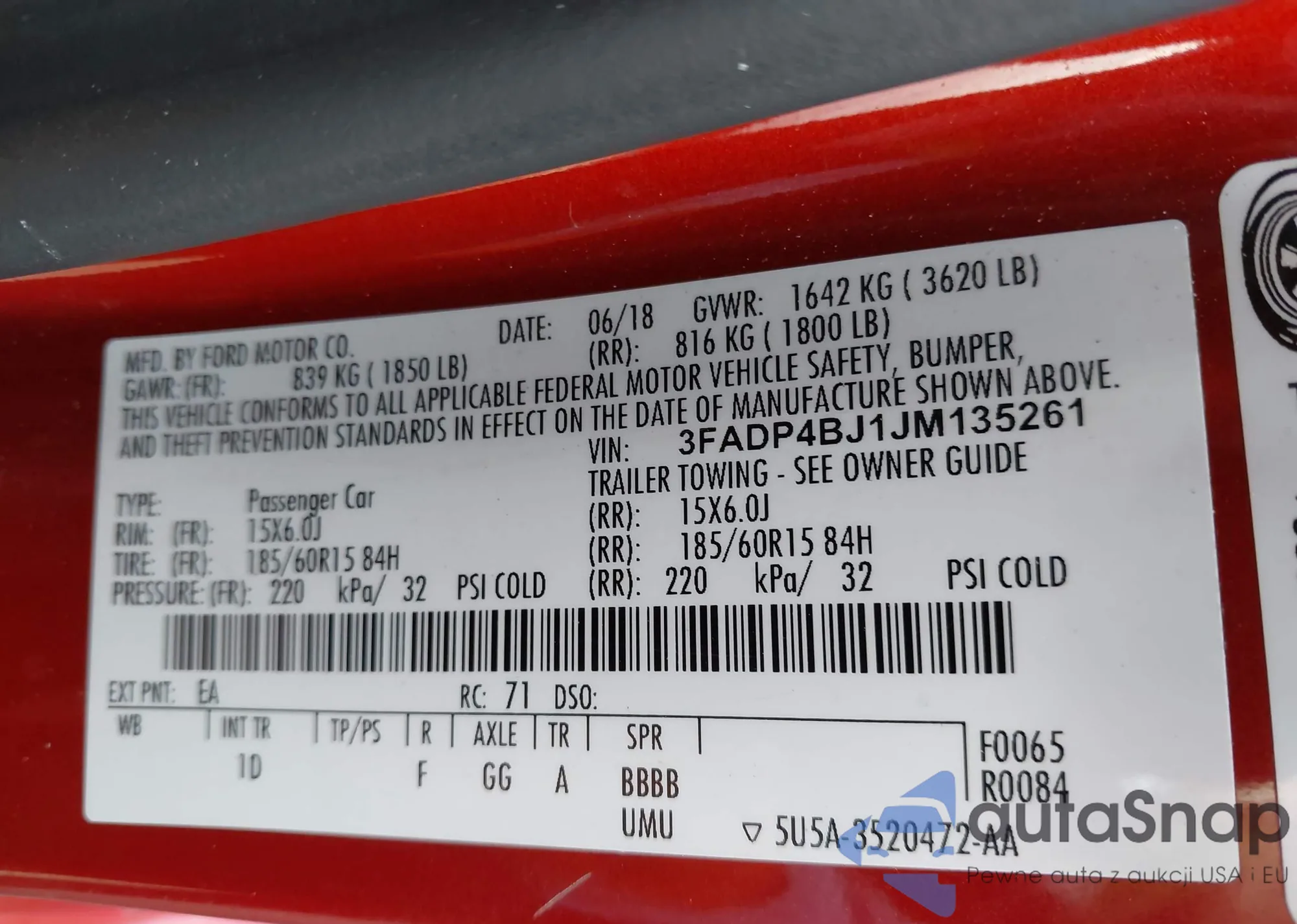 • VIN 3FADP4BJ1JM135261