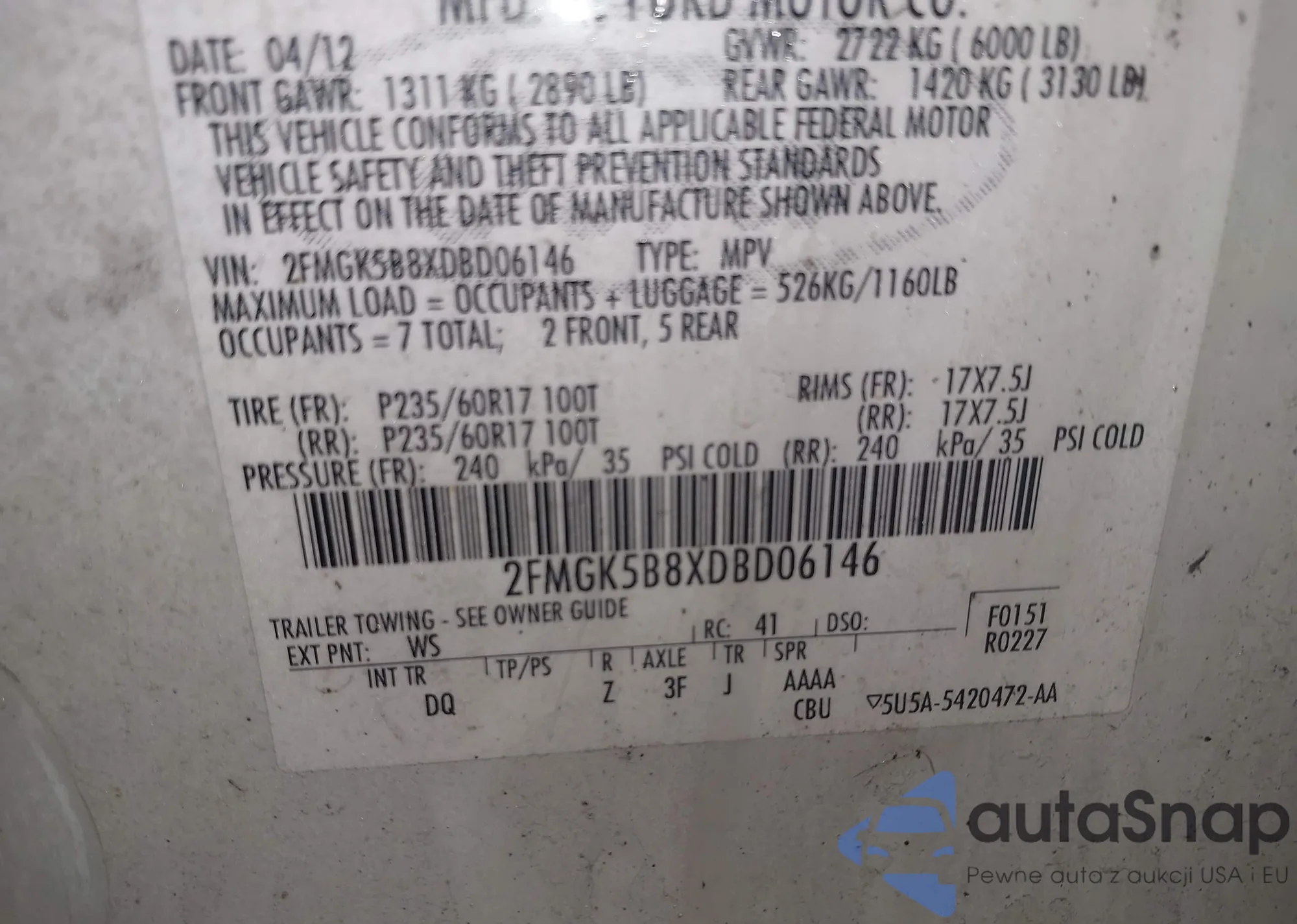 • VIN 2FMGK5B8XDBD06146