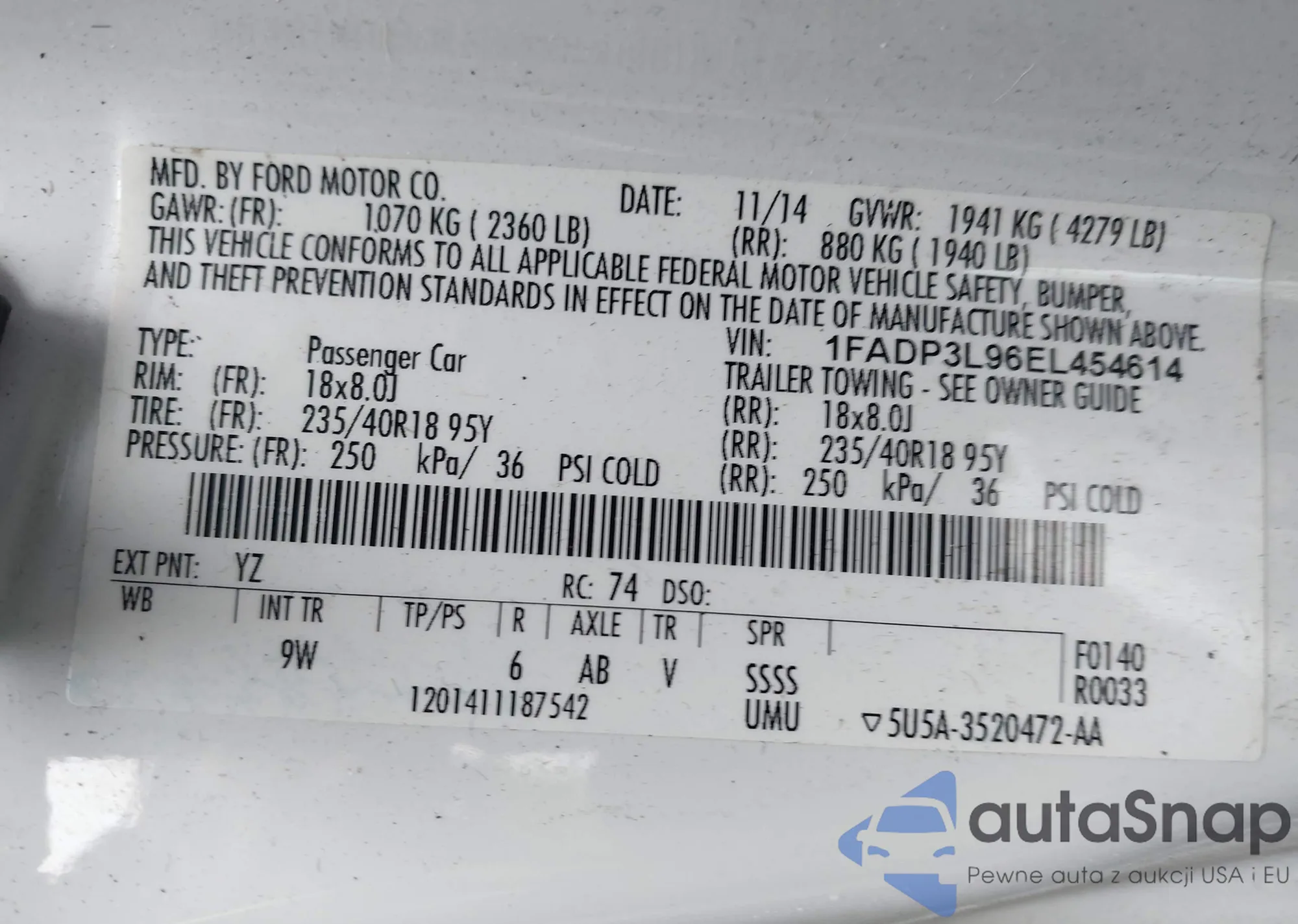 • VIN 1FADP3L96EL454614
