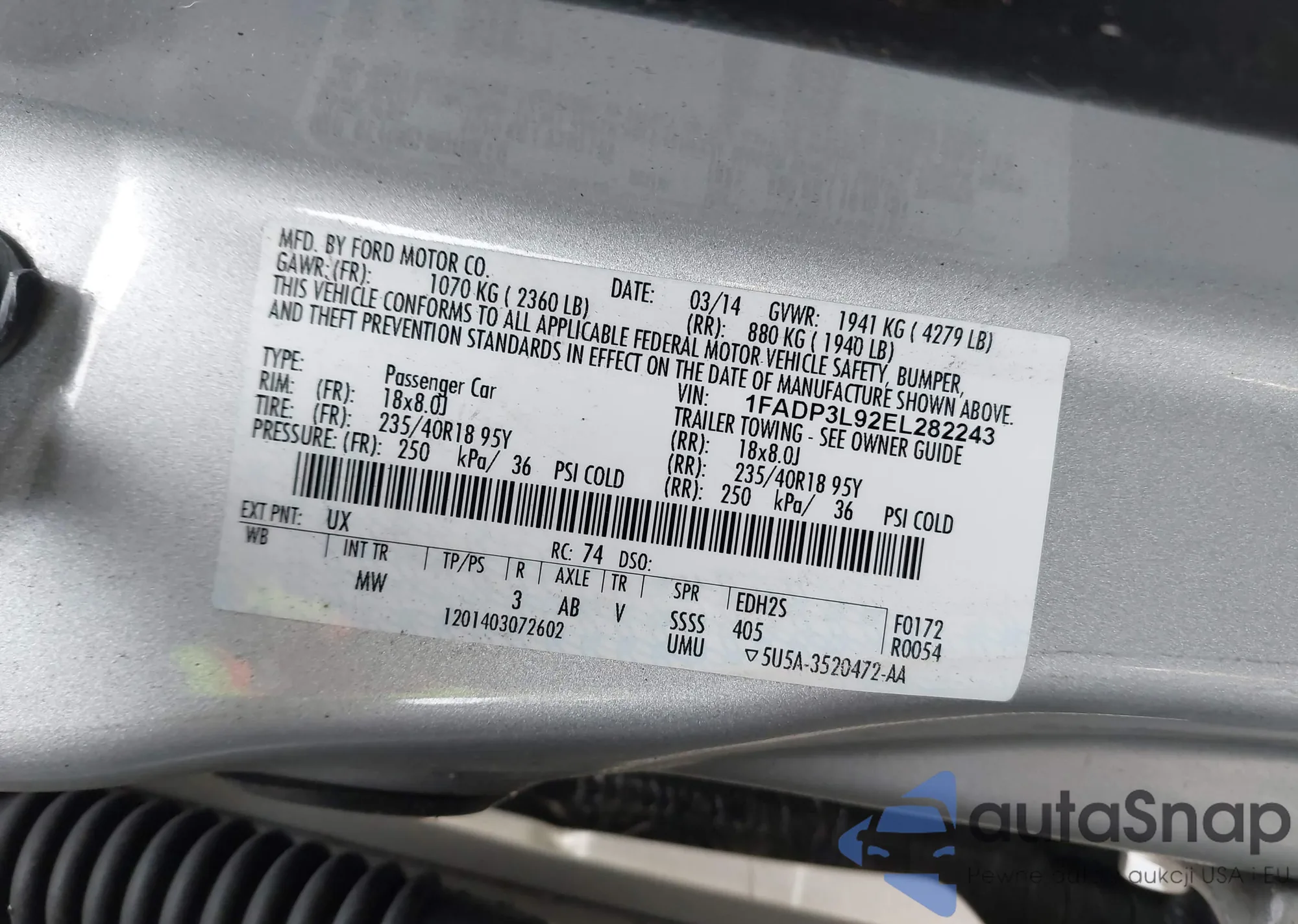 • VIN 1FADP3L92EL282243