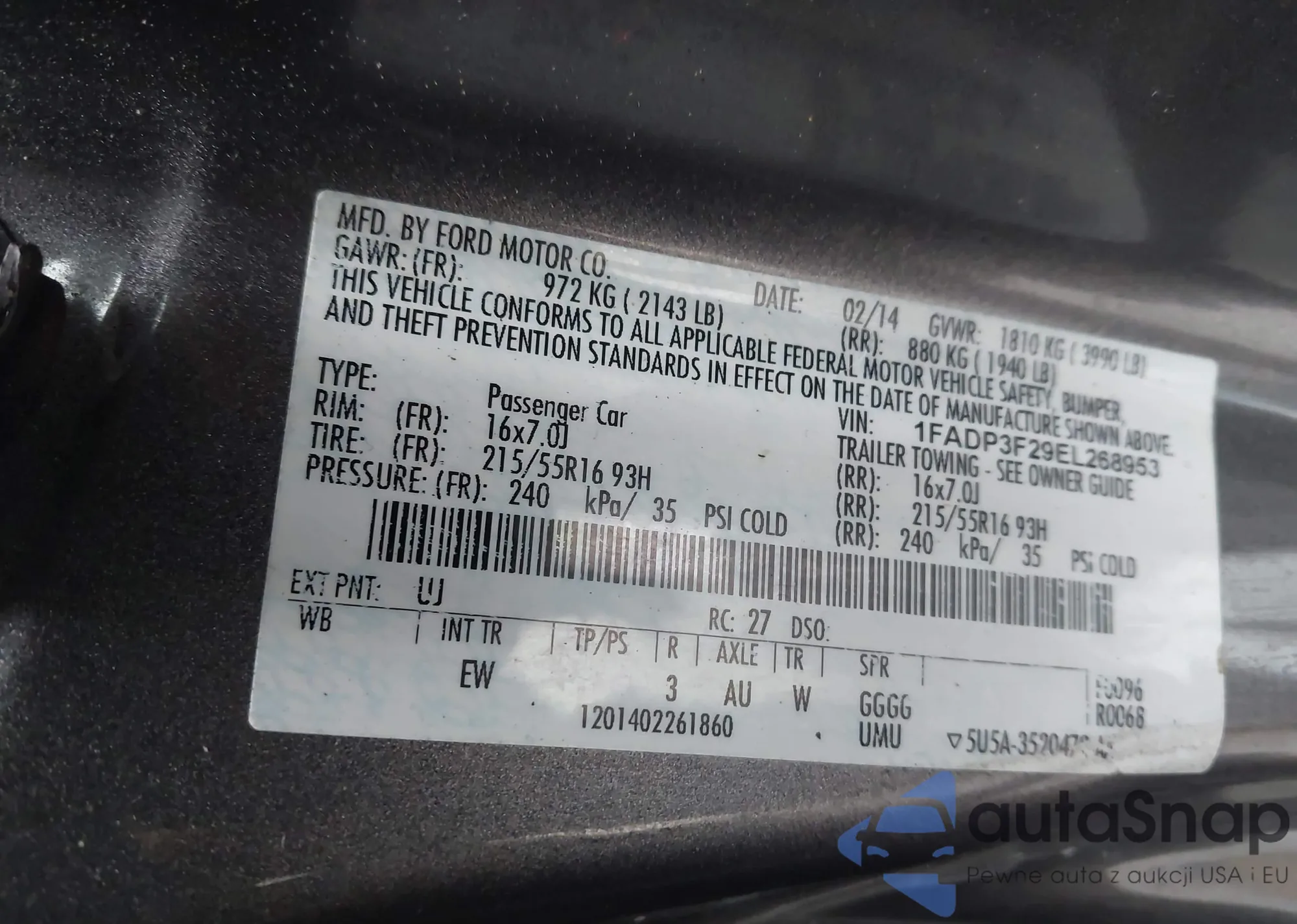 LOT: 44215488 VIN: 1FADP3F29EL268953