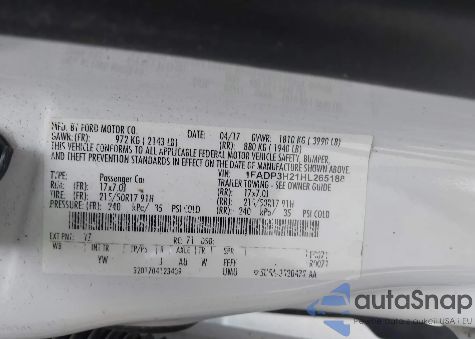 LOT: 43904153 VIN: 1FADP3H21HL265188