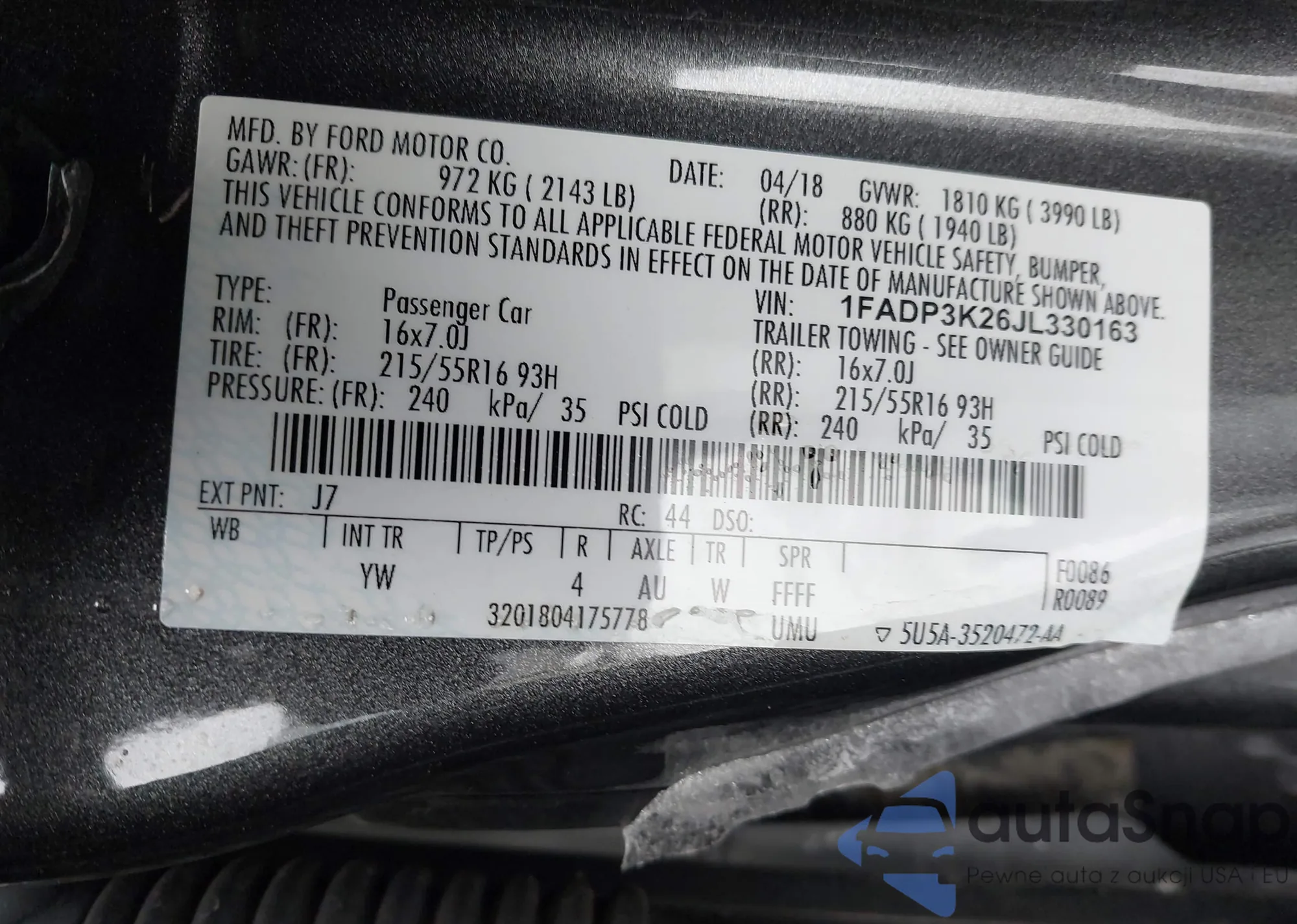 LOT: 44292822 VIN: 1FADP3K26JL330163