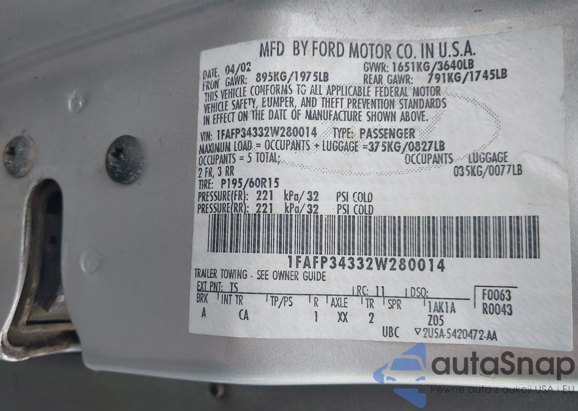 LOT: 44366420 VIN: 1FAFP34332W280014