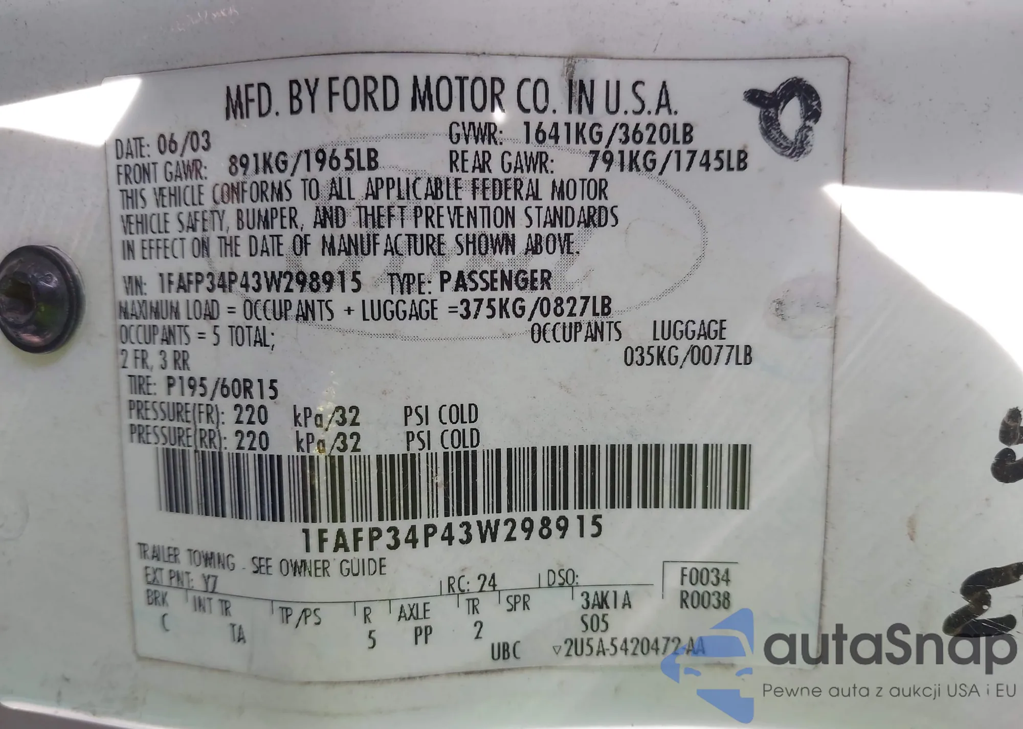 LOT: 44344602 VIN: 1FAFP34P43W298915