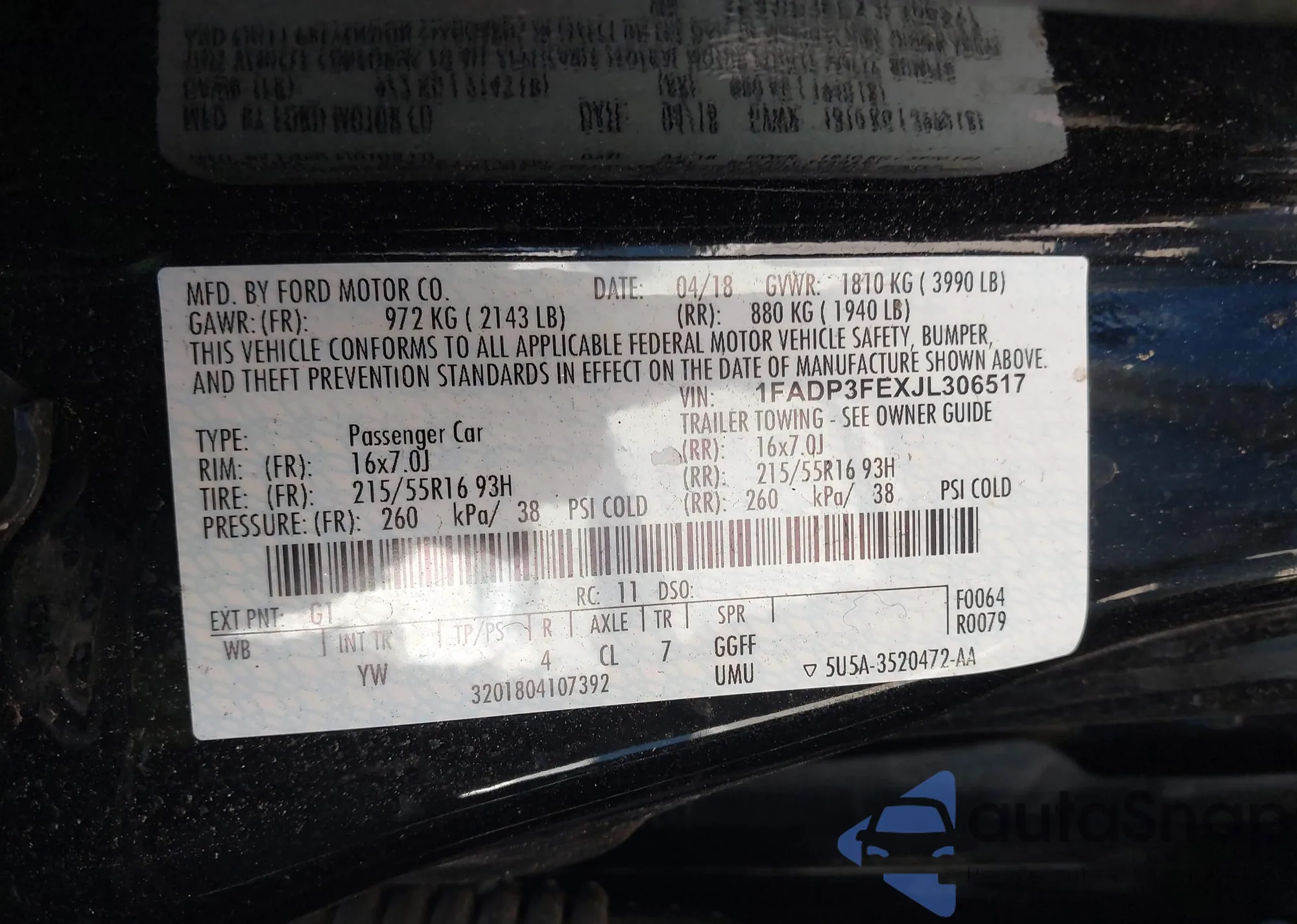 • VIN 1FADP3FEXJL306517