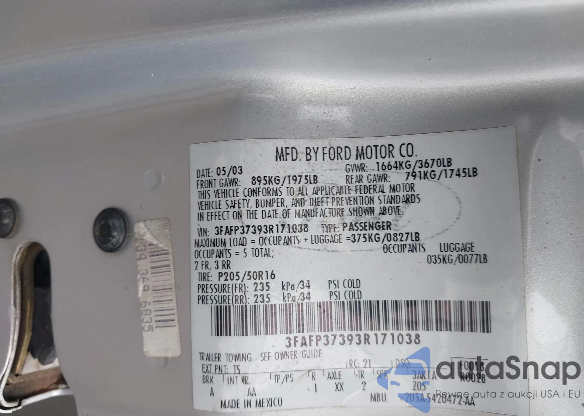 LOT: 43490938 VIN: 3FAFP37393R171038