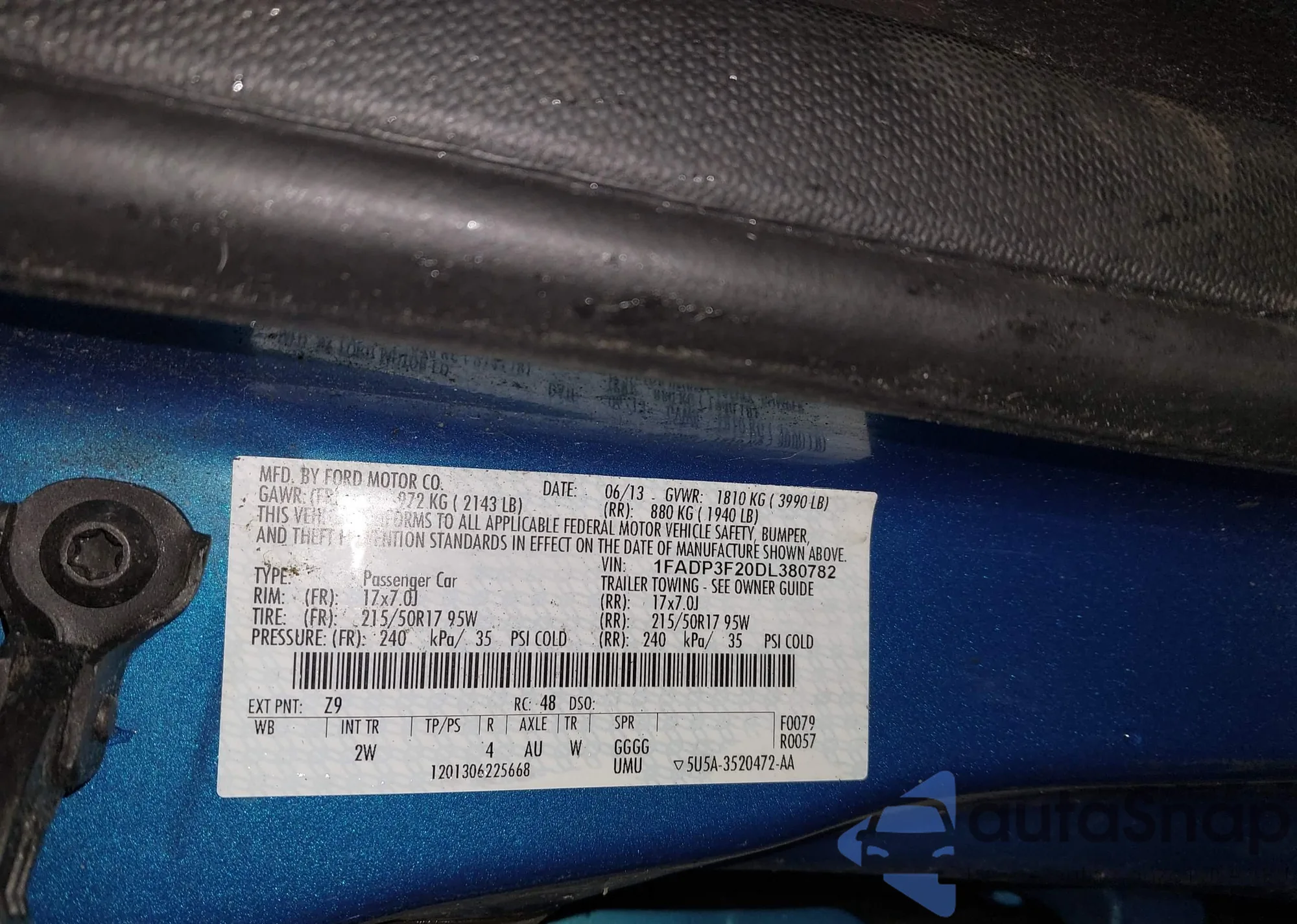 • VIN 1FADP3F20DL380782