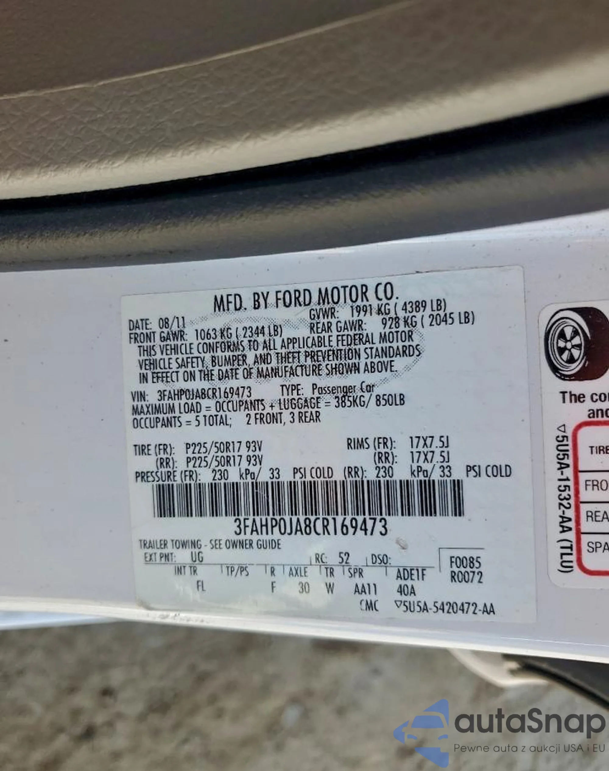 • VIN 3FAHP0JA8CR169473