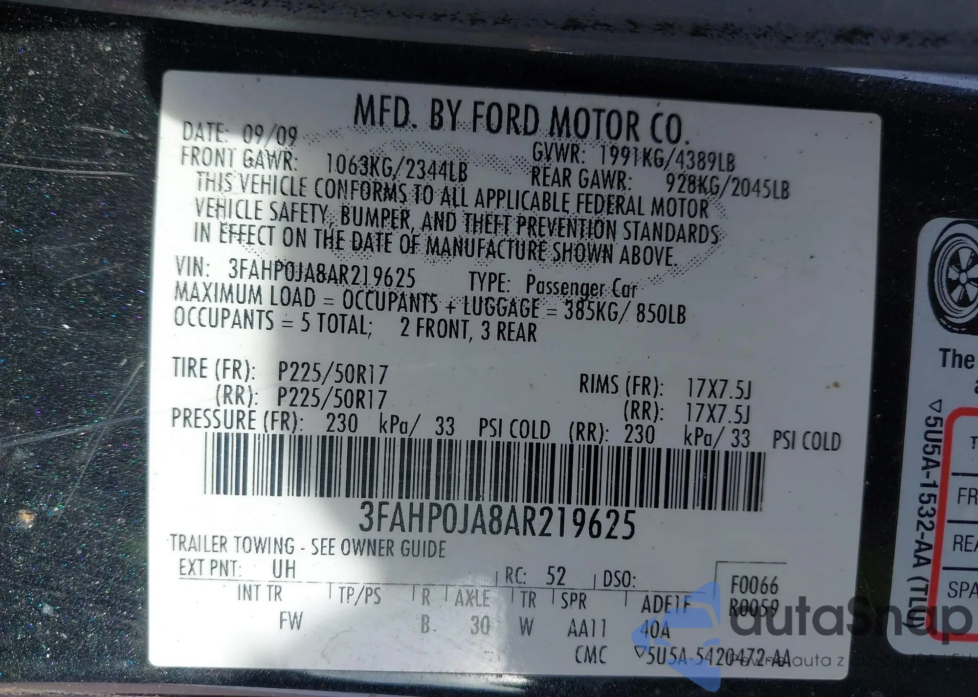 • VIN 3FAHP0JA8AR219625