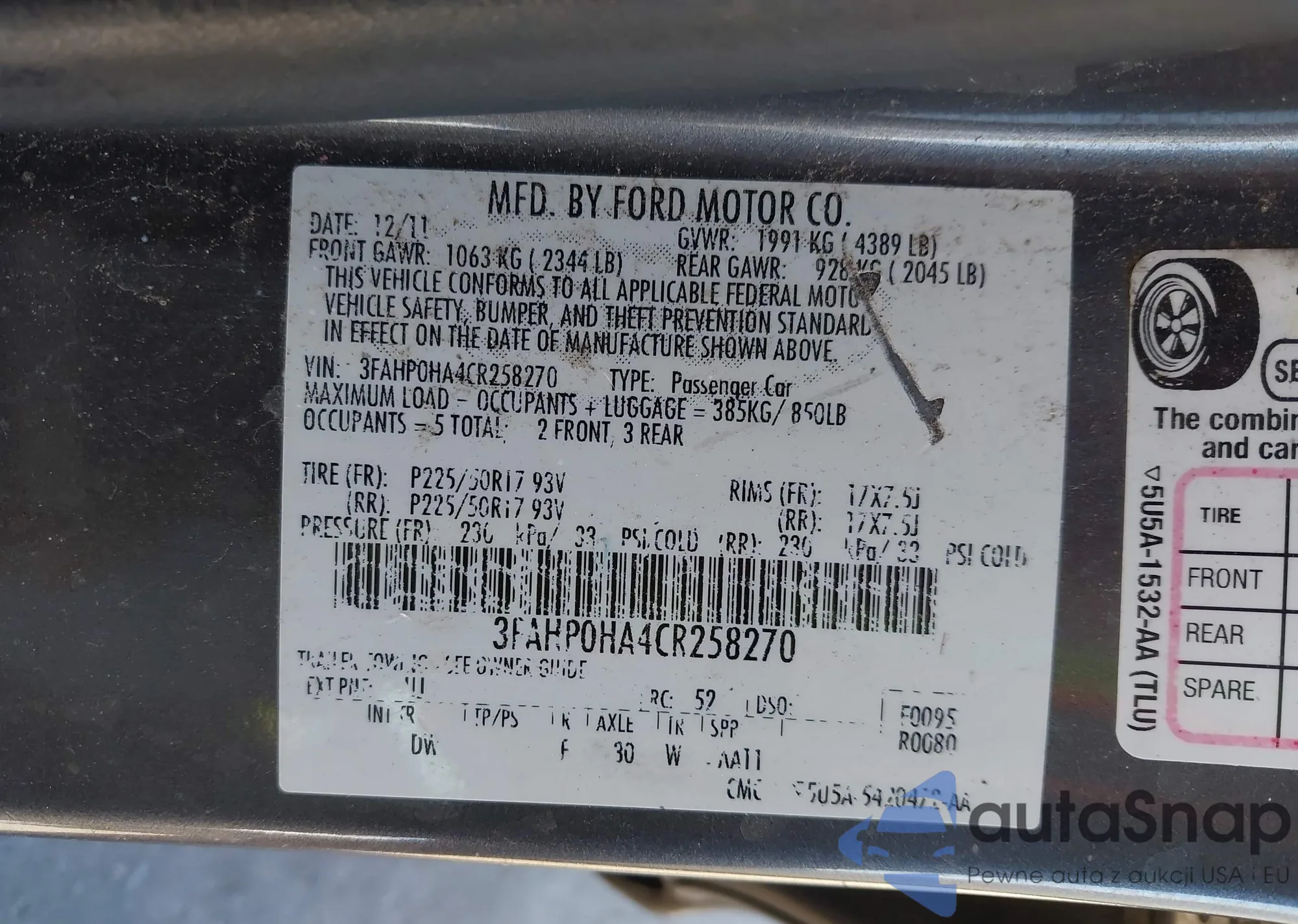 • VIN 3FAHP0HA4CR258270